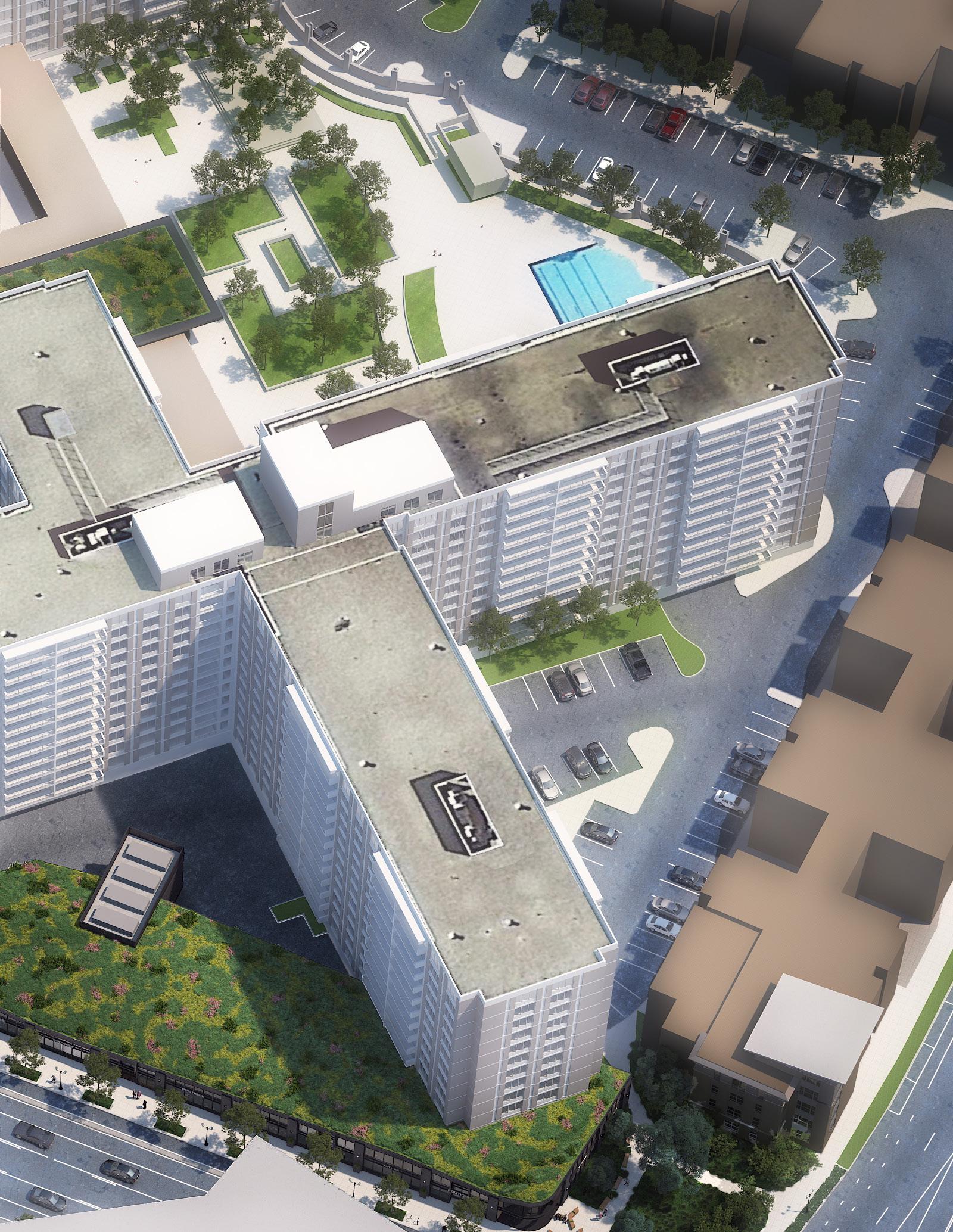The project was designed as a courtyard building starting on the second floor facing Addison Avenue. This is done in order to minimize the building’s presence along Addison Avenue in addition to maximizing the amount of afternoon sun that would reach the outdoor pool. The building is set back from Addison Avenue, creating the appearance of a 7-story structure.