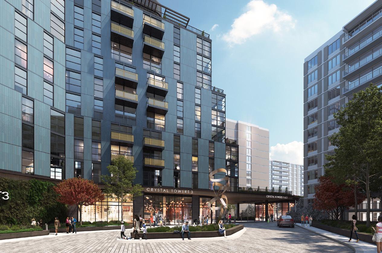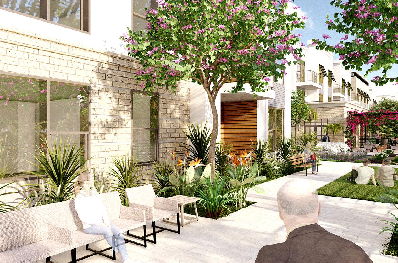 The architecture features undulating designs with stoop units along the facades, enhancing the walkability and community engagement of the area. This phased development cleverly integrates parking within residential buildings to maintain a pedestrian-friendly environment. Central to the site is a retail hub surrounded by diverse commercial spaces, anchoring the community and providing vibrant social gathering points.