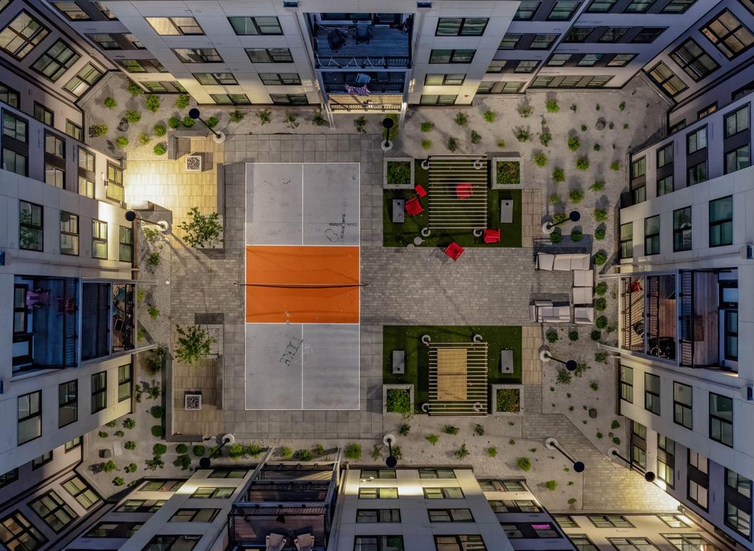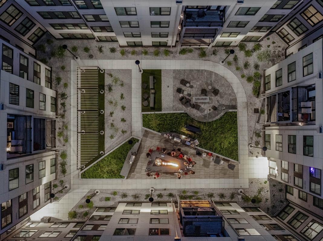 Also unique about the quarter-block-sized residence is the interior drop-off sequence. Through a cleverly designed interior porte cochere (a covered drop off space for vehicles) on the first level, residents can seamlessly make their way into the building. This feature will be especially useful during the colder winter months. Once inside, residents can enjoy views not only to the river and skyline. Also, thanks to a community art collaboration, residents and visitors alike will be able to take in stunning commissioned murals canvasing the neighboring structures.