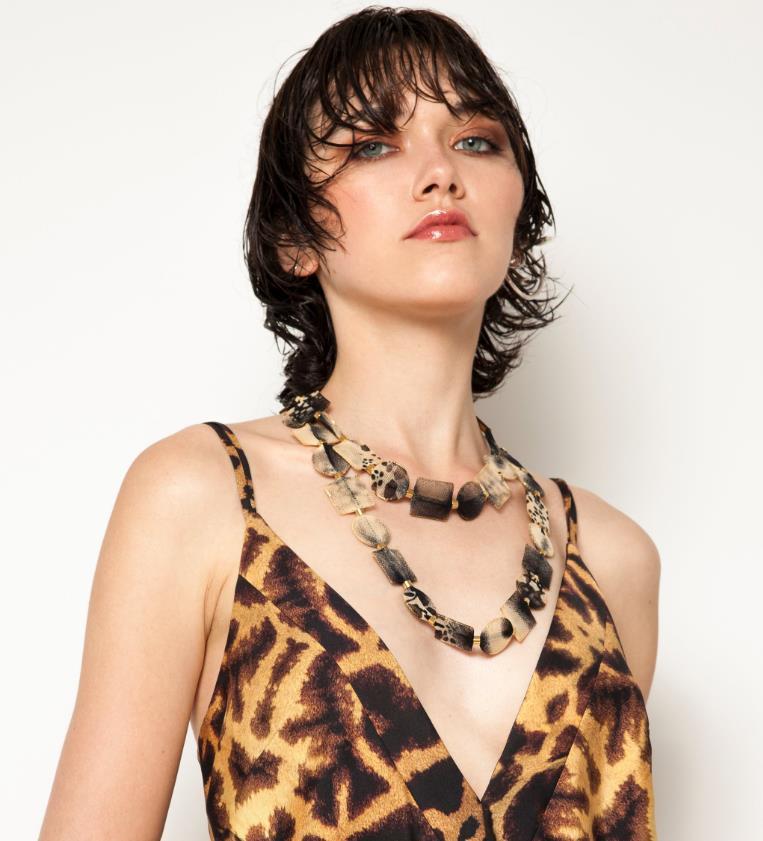 Sinceleopardprintisthenewhotneutralforfall,thisjewelryconceptisbasedonwhatitemswouldpair wellwiththemust-havepatternoftheseason.Focusonfashionmetalsthatarechunkierinscalebutadd touchesofbrownaccentslikecrocinlaysortigereyesemi-precious.