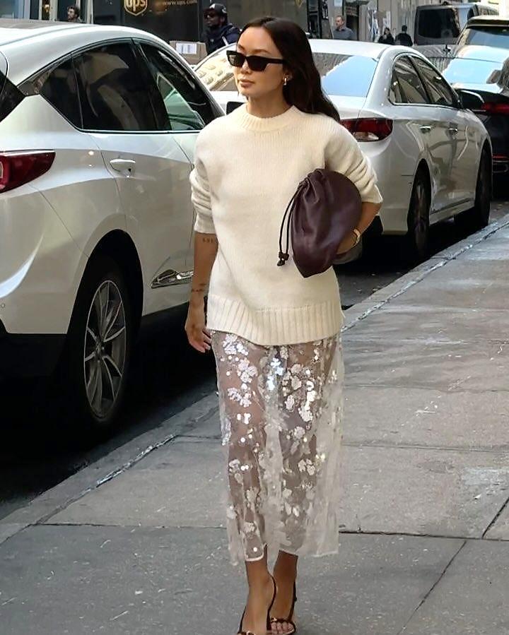 Sequins slip into daylight with new subtlety ; worn over cotton, paired with denim, and styled like second nature. What once belonged to evening now feels effortless and undone, proof that a little shimmer belongs as much to morning light as it does to midnight.