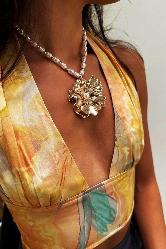Thisisamodernapproachtoeffortlessmetalsthatcanbedressedupordown.Welovethemetalshapeofthisconcept becauseithasanorganicflarebutstillfeeltimelessandcasual.Althoughpendantsarestillrelevantandhavebeenthe silhouetteofthesummer,weareseeingthekeyitemnecklacetransitioningtobemoreofaboldmetalcastedlookwith lotsofmovement.