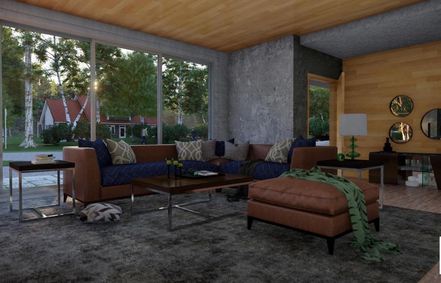 Top: rendered image of wooden interior furnishing.