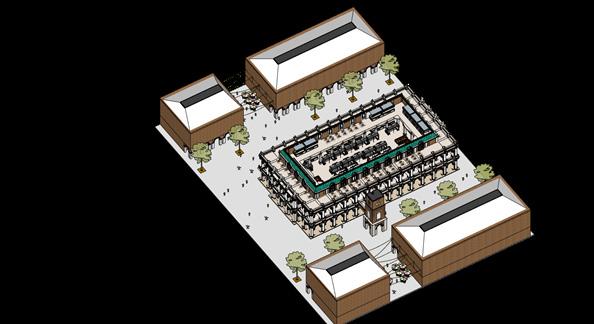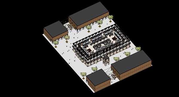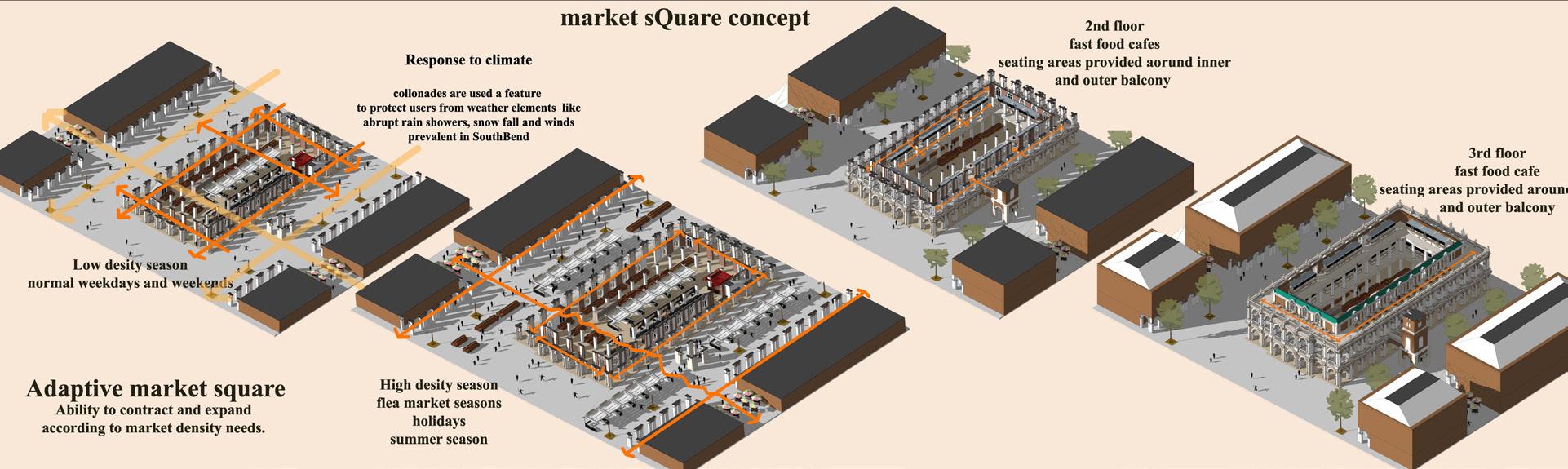 The market square takes precedence from Faneuil market Center, Boston. The program features a central main civic building and two parallel blocks on either side. The side blocks perform retail functions on the street level and may offer office/ more retail on upper floors. The square space may also serve as gathering space for festivals, flea markets and special events in the city.