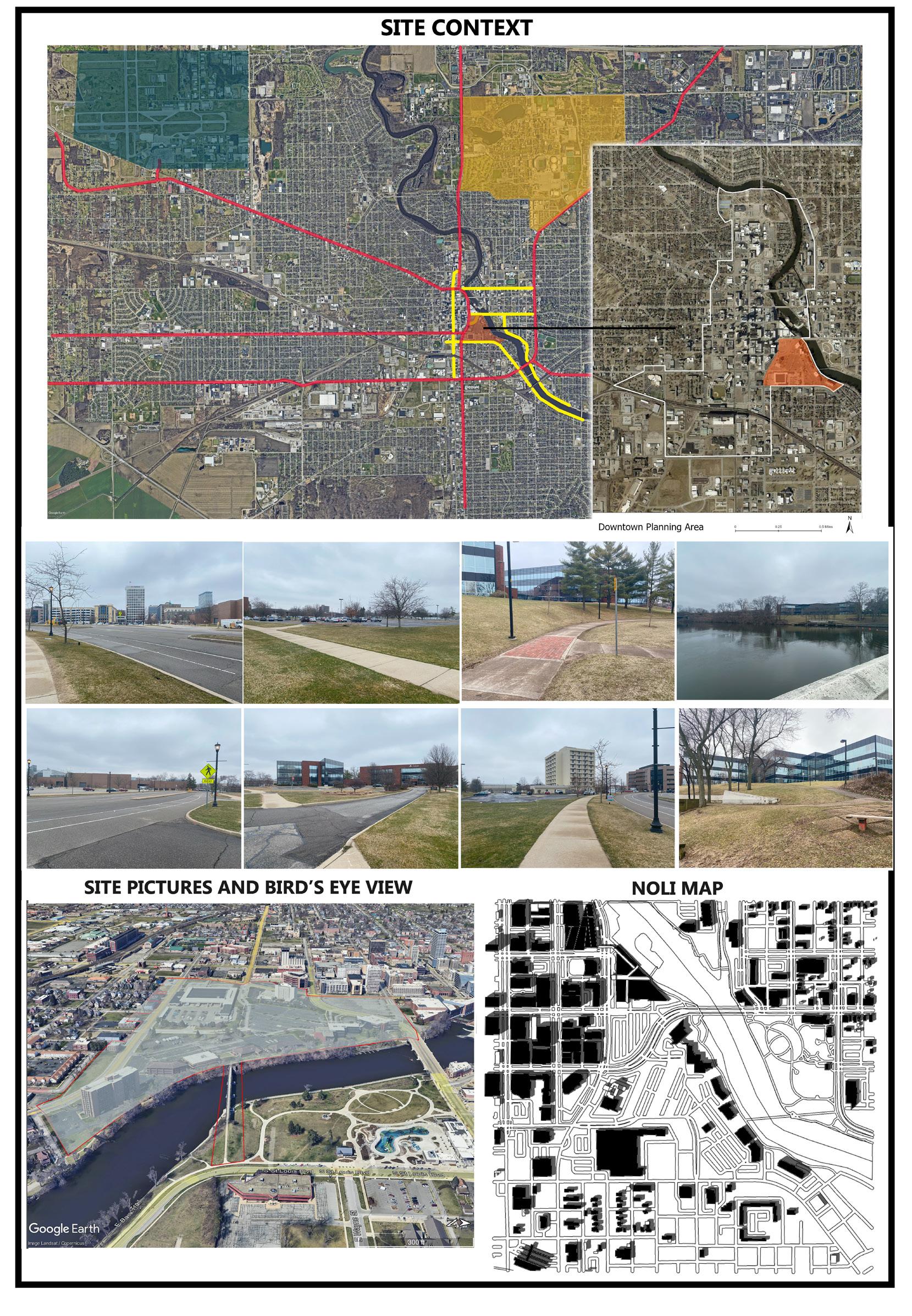 The project site is located in downtown SouthBend opposite Howard park. The site measures about 4 acres and is largely covered by parking lots and sparsely spaced buildings. The site is bordered by a city transect to the northe and east, a neighborhood transect to the South and St. Joseph river to the South. The project objective is to re-purpose the site to host multi-use buildings blocks that would attract retail and residential developments.