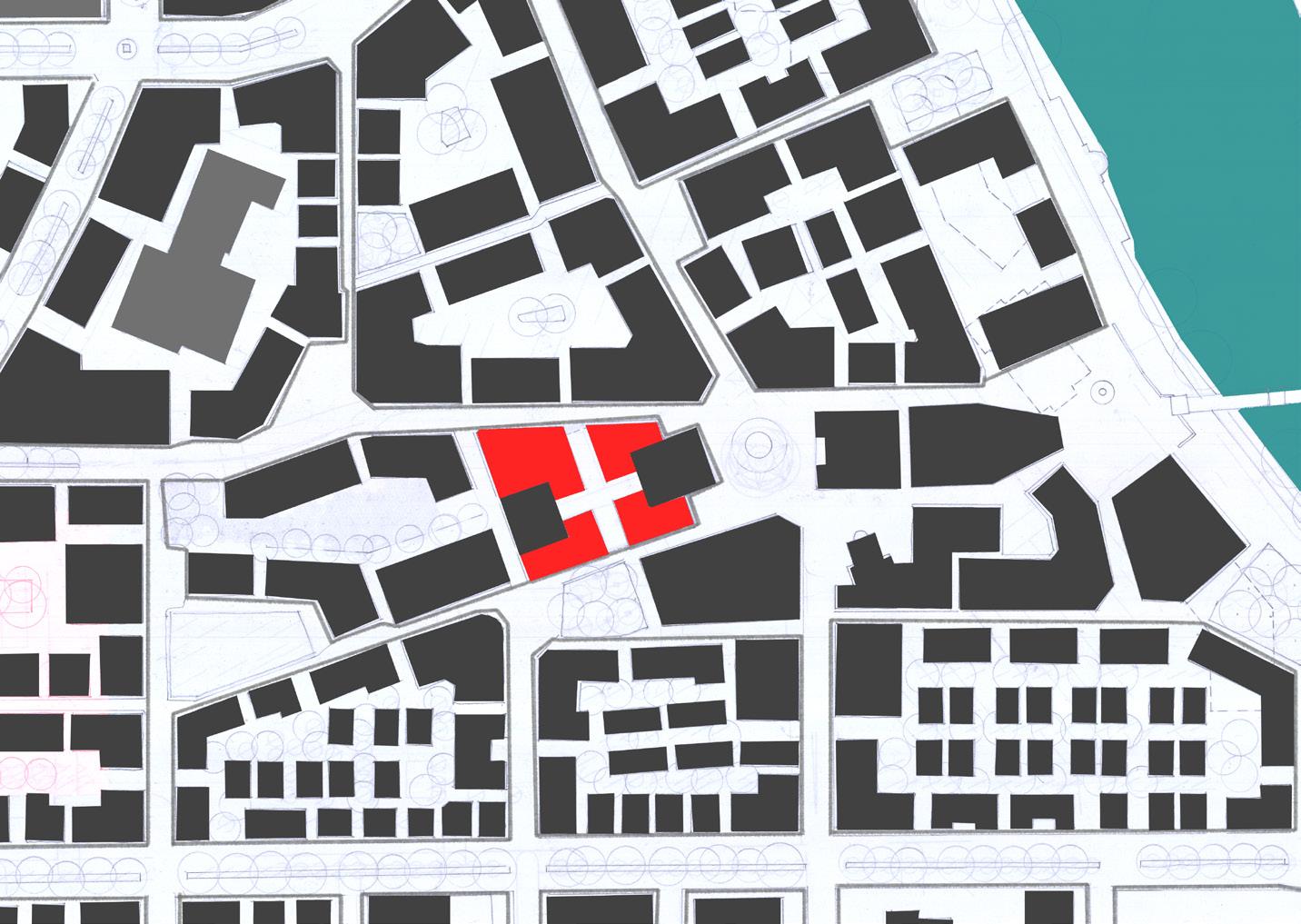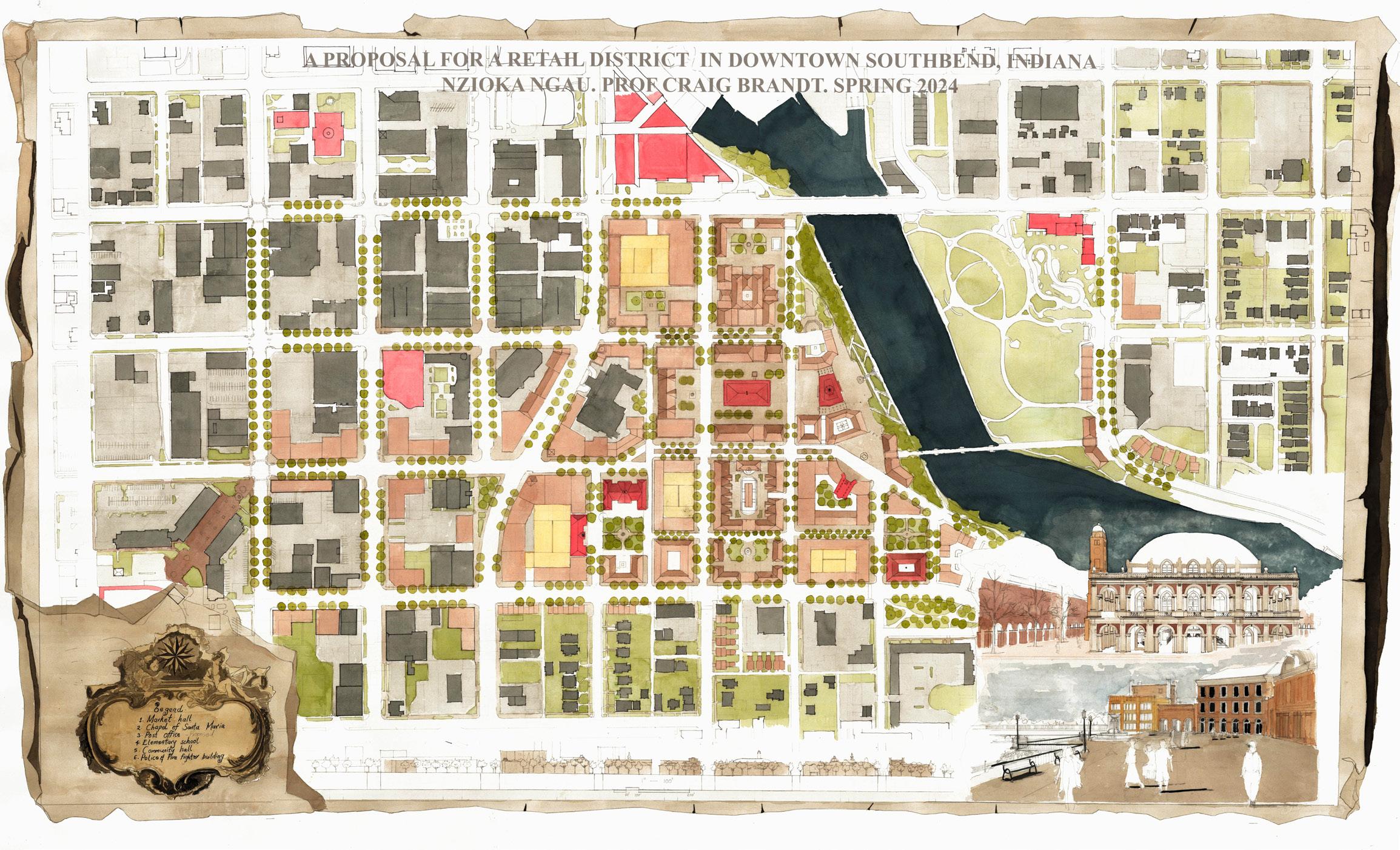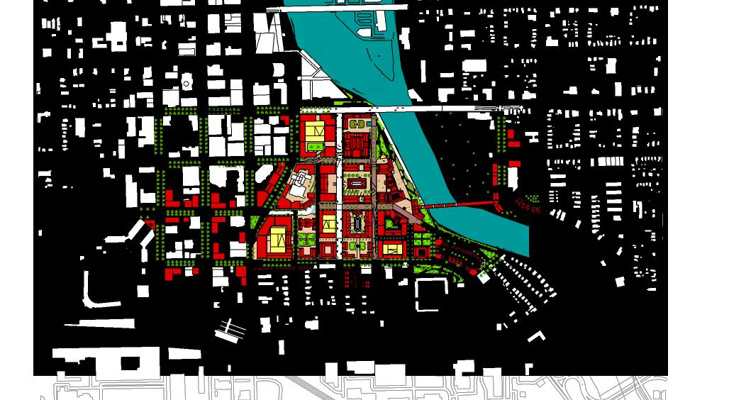 The colored buildings represent block infills proposed. The block functions include: civic (red), blue(residential), orange( commercial -flex), purple (mix-use residential/retail) and pink( market blocks). The market(shopping center) would have three experiences: the boutique market(north), the basilica hall and the garden market(south). additionaly the site is fitted with promenade streets that draw visitors towards the river.