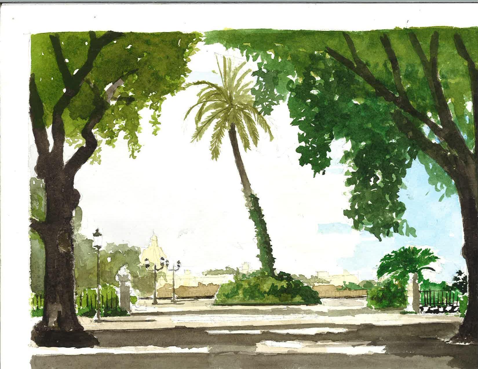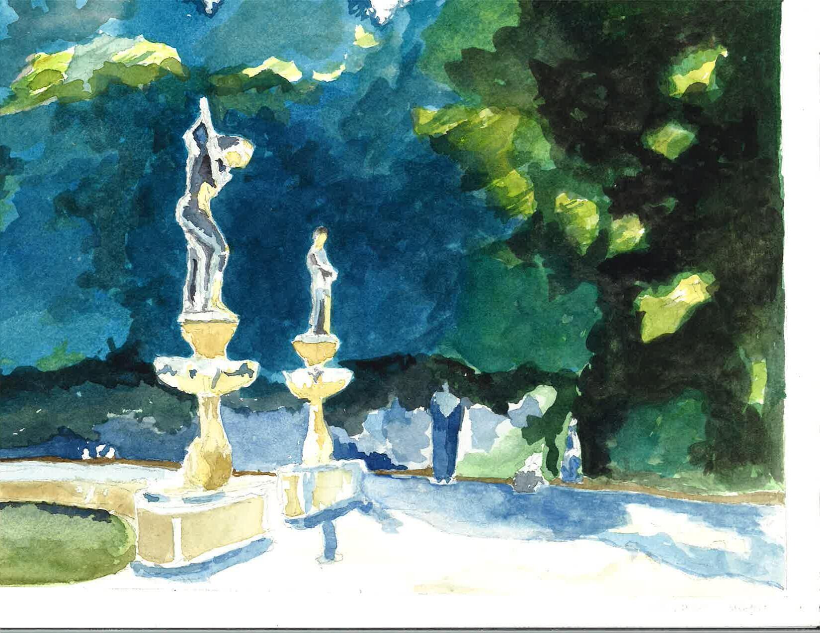 Bottom: A watercolor painting at Fontana Mose salvatto dalle acque looking towards Busto di Gaetano Filangeri (VIlla Borghese gardens)