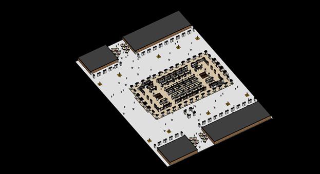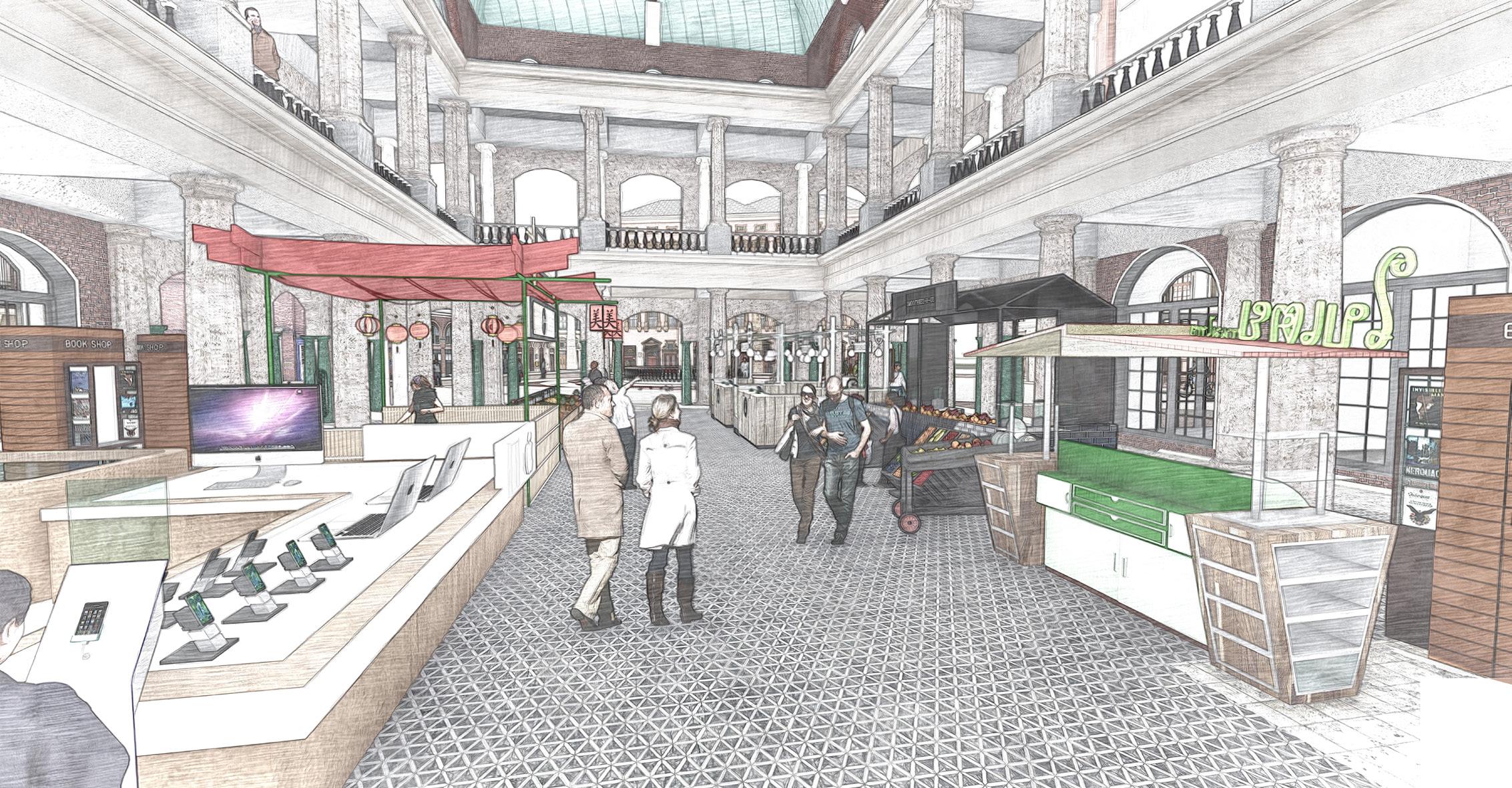 The Basilica concept proposes flexibility of market halls to serve more functions. In this scenario the buildings first floor can be used for indoor retail or partitioned stores with cross paths connecting both sides of the market square.