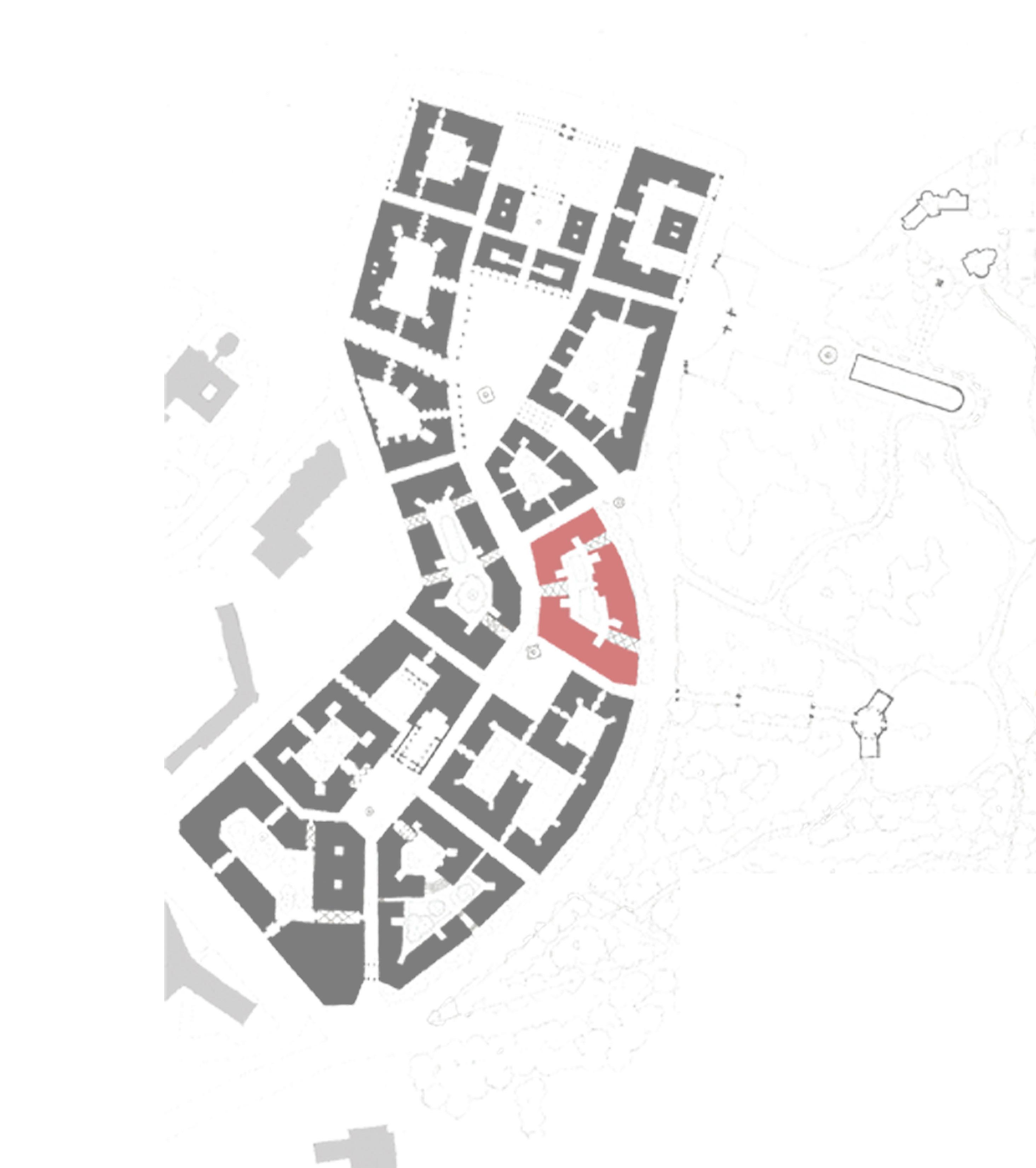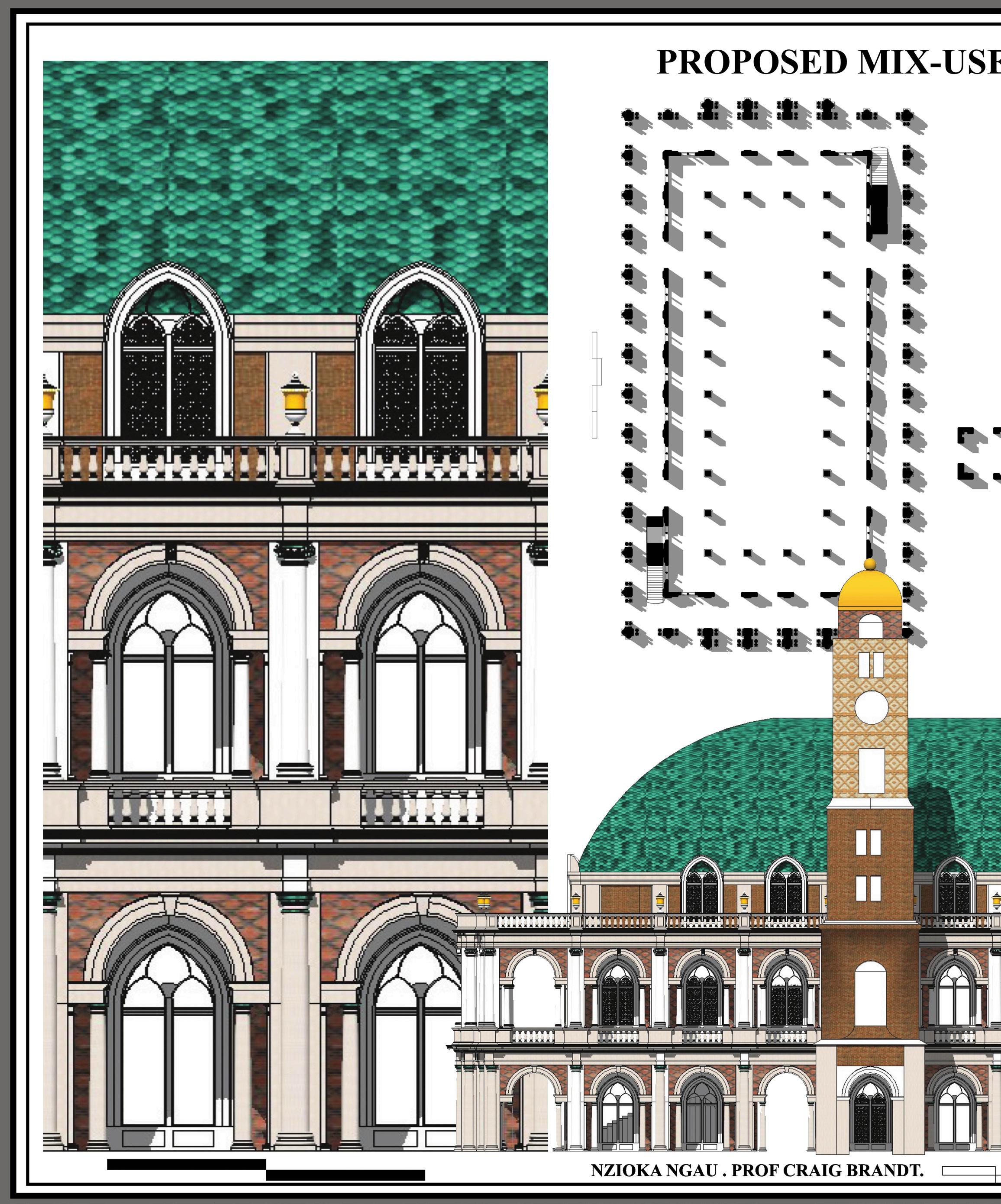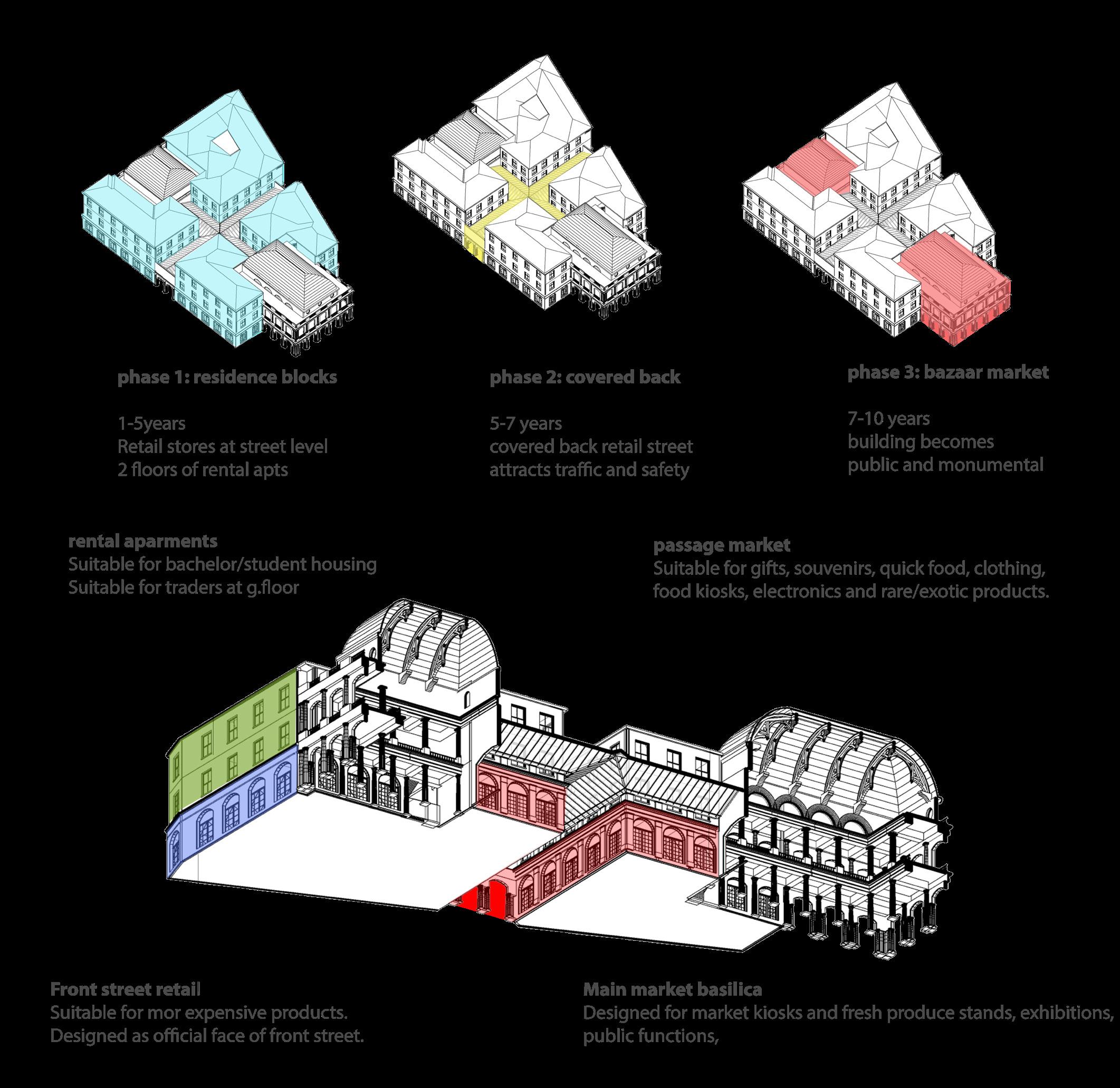 The proposal is located opposite Howard park. Superblocks define the urban fabric, with mixed -use retail/residential blocks sandwiching residential buildings. The main market building is located at the central piazza served by 6 pedestrian streets. The block is developed to as a mix-use residential/ retail block and in later phases features covered streets leading into tripple height bazaar market