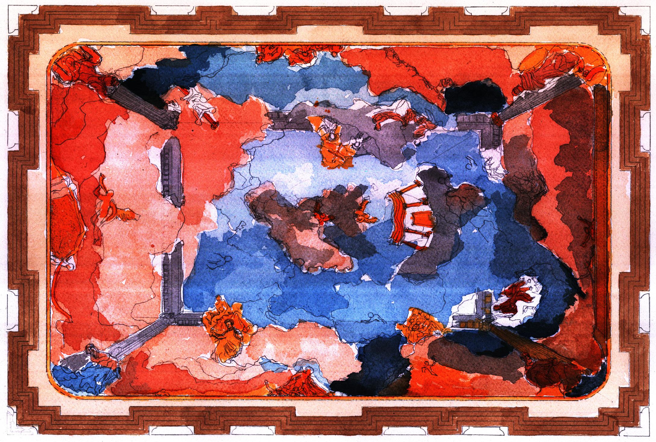 Bottom: Rendered image of ceiling frescoe on conference rooms.