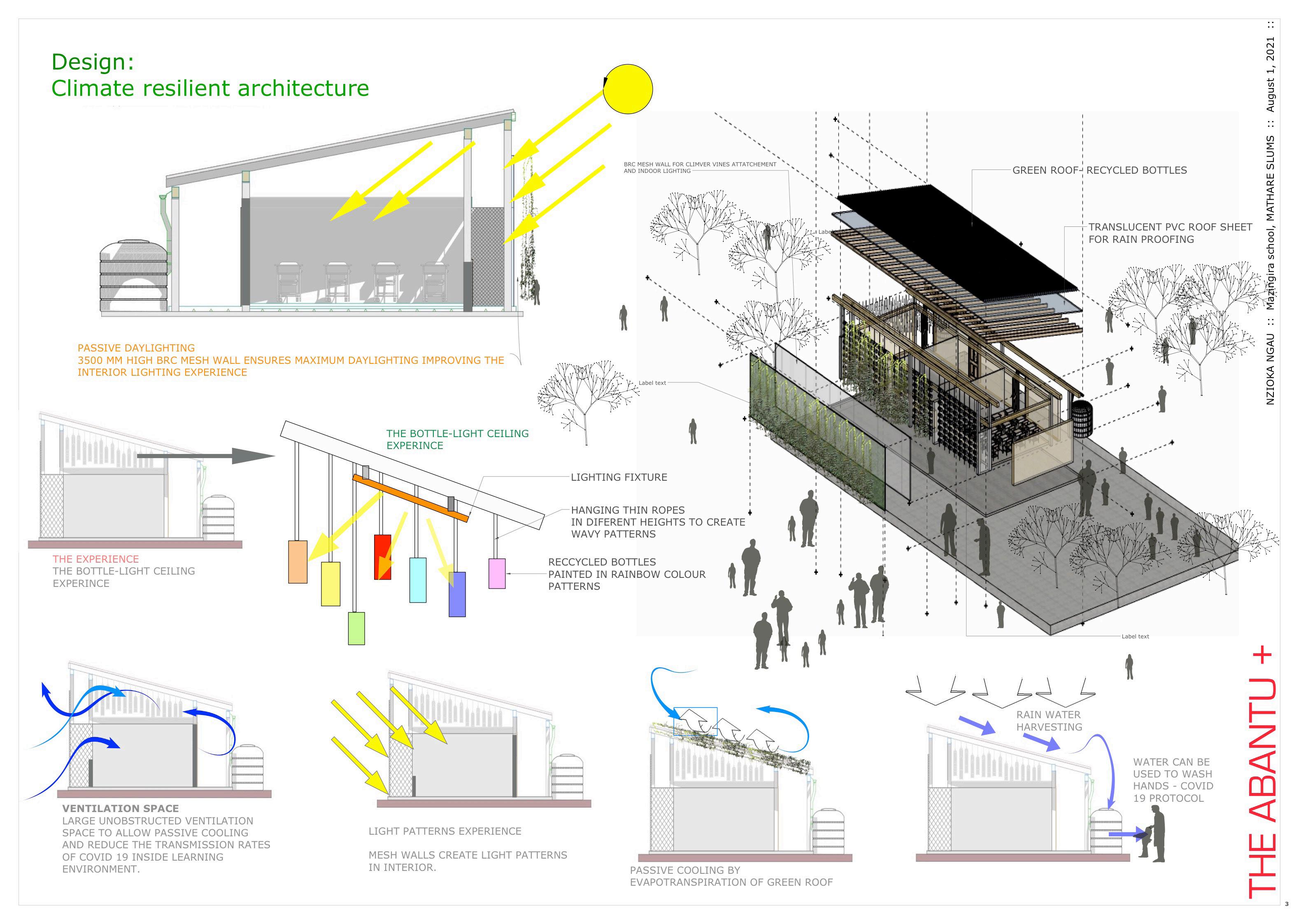 The project proposal explores how to equip urban low-income communities with skills they would need to implement sustainable community schools. Features of this module include simple wooded frameworks, planter wall, green planter roof, water harvesting, plastic re-use, classroom garden and passive lighting and ventilation. The simplicity of design would allow for the community to learn and build more modules unsupervised.