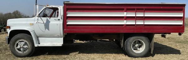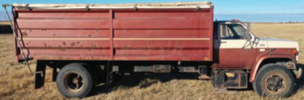 ● 1987Chevrolet 70 s/a 3 tongrain truckw/18’ box,246,229km,366 gas,rolltarp,silageendgate,11R22.5tires, 10F/2R,HI/LOrange.