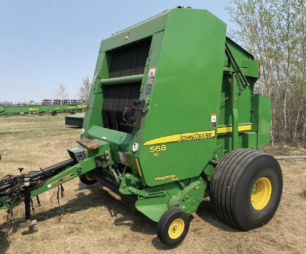 ● 2012JOHNDEERE568roundbaler w/megawidepickup,ONLY4,498 bales,twineornetwrap,21.5L–16.1SLhighflotationtires,pushbar, hydraulicpickup,variablecorevalve,incabmoisturemonitor,1000pto, hasneverbeenrainedon,shedded,mintcondition.