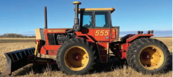 ● 1982VERSATILE555 4WDtractor w/Leon14ft.blade,7,073hrs., 210 hp Cummins,1000pto.,18.4 X 38duals,15F/5R, 4 hyd’s,VGcond.