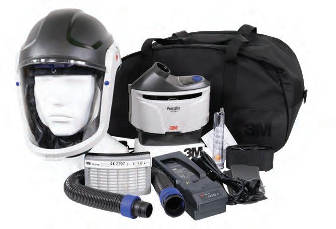 • Headgear used as part of certain PAPRs can accommodate workers with limited facial hair & prescription eyewear Kit contains: M-307 helmet, PAPR unit, breathing tube, battery, charger, filter, airflow indicator, pre-filter, filter cover, belt in padded storage bag