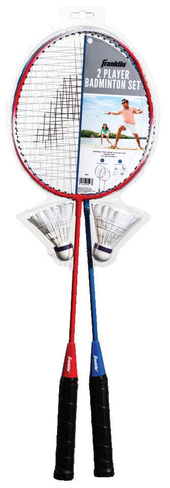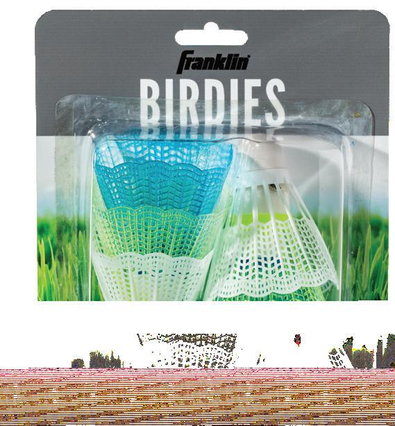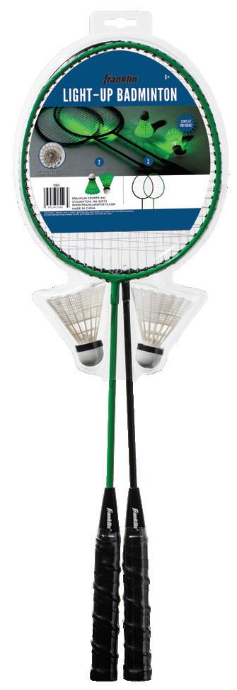 RACKET: (2) Steel SHUTTLECOCKS: 2 PACKAGE: Hanging clam • • • 2 PLAYER BADMINTON SET ITEM: 52623 PACK: 6 RACKET: 2 Steel (LED lit) SHUTTLECOCKS: 2 (LED lit) EASY on/off switch. Stays lit for hours! PACKAGE: Hanging clam • • • • 2 PLAYER LIGHT-UP BADMINTON SET ITEM: 52624 PACK: 6 SHUTTLECOCKS: 3 MEDIUM flight speed PACKAGE: Blister • • • SHUTTLECOCKS ITEM: 52618 PACK: 24 ITEM: 52619 PACK: 24 LIGHTS UP IN THE DARK Contains 2 "CR1220" and 2 "CR927" button cell batteries. (Included, BUT non replaceable). Do not dispose of batteries in fire. Batteries may explode or leak. BIRDIES: 6 SLOW flight speed PACKAGE: Blister BIRDIES • • • 6+ 3