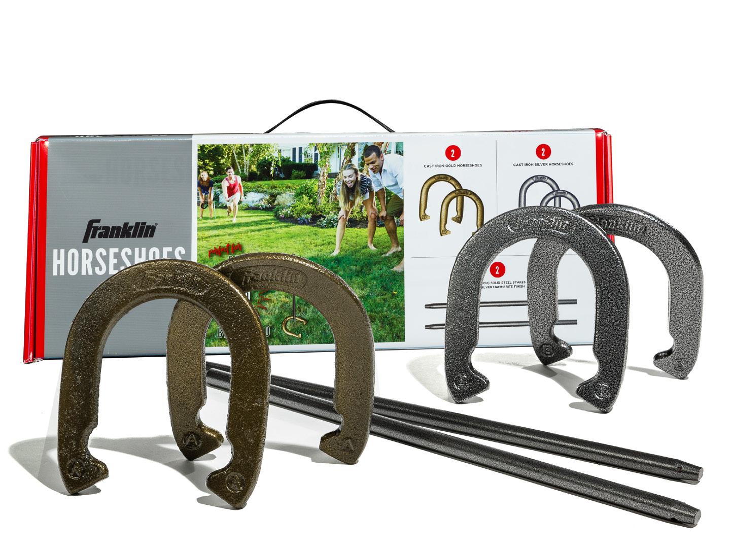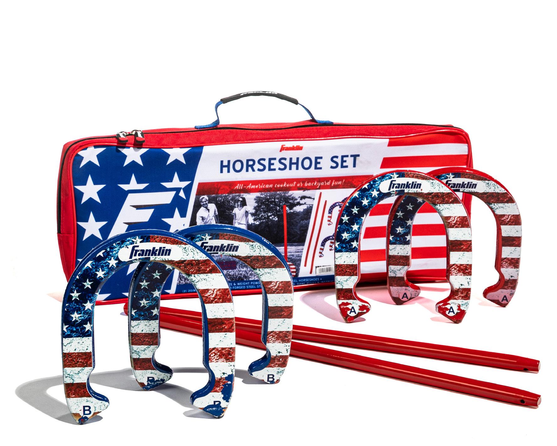 HORSESHOES: (4) Official size & weight MATERIAL: Powder-coated cast steel STAKES: (2) 20" solid forged steel PACKAGE: Carry bag with handle ITEM: 50011 PACK: 2 • • • • RED, WHITE, AND BLUE SERIES 32