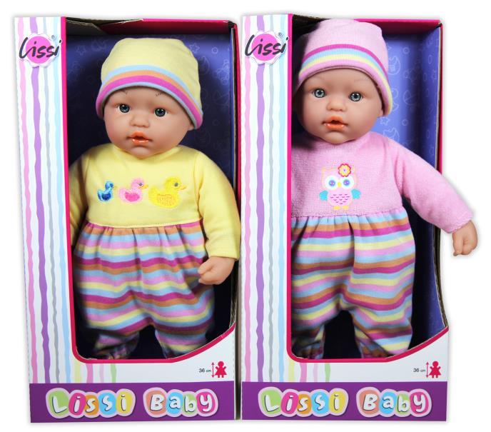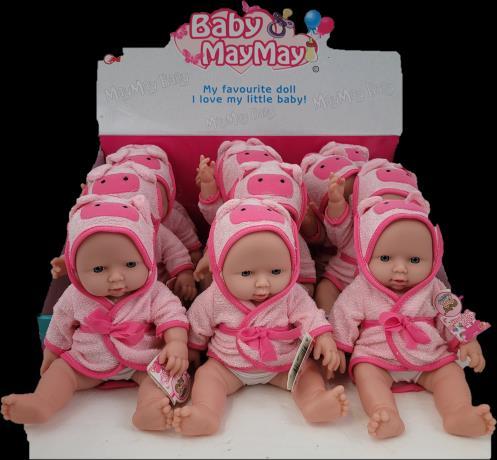 baby doll. Soft bodied baby makes 6 sounds. Assorted 4 pink, 2 blue. Min 6. pcs. For ages 3 & up. $15.00