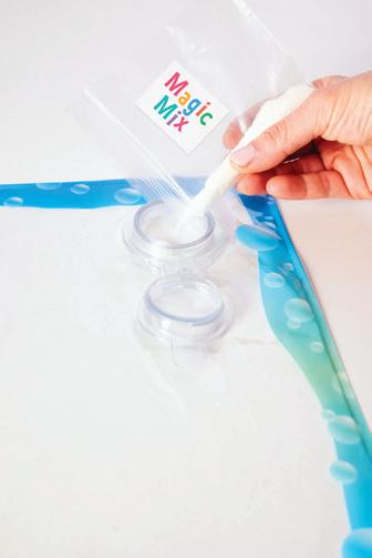 • Fill the 15” x 13” sensory bag with the colorful mix-ins included. Add water to the Magic Mix and watch it transform into a finger-squishy, sensory gel. Place the activity cards under the bag and get ready to squish, sort and explore