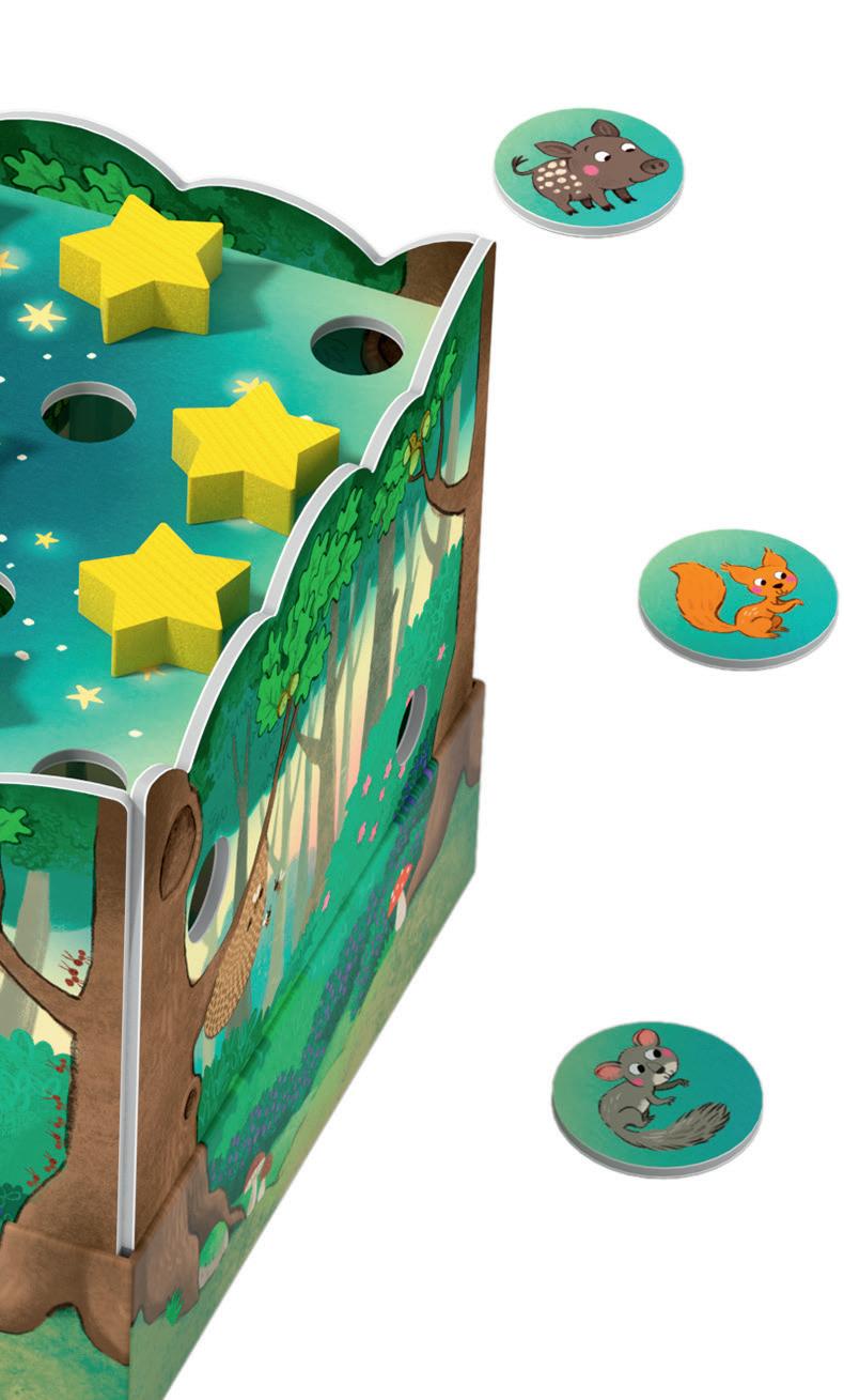 Les animaux en peluche ont égaré leur chapeau préféré. Mais avec l’aide des enfants, Cathy le canard va pouvoir les aider dans deux jeux de classement. En mode coopératif, ils gagnent tous ensemble s’ils parviennent à classer 6 chapeaux avant la tombée de la nuit, lorsque toutes les tuiles « étoile » sont retournées. Ils peuvent aussi jouer en mode compétitif : qui sera le ou la première à bien classer ses 3 chapeaux ? Deux jeux de classement et d‘observation. Livrable en boîtage français.