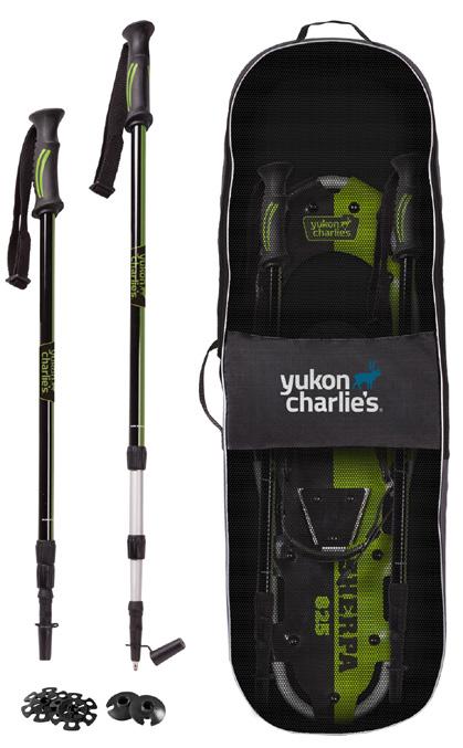 Kits includes 2 snowshoes, 2 6000 aluminum poles with rubber grip, Twist-Lock adjustments, trekking & snow baskets, and durable carry bag.