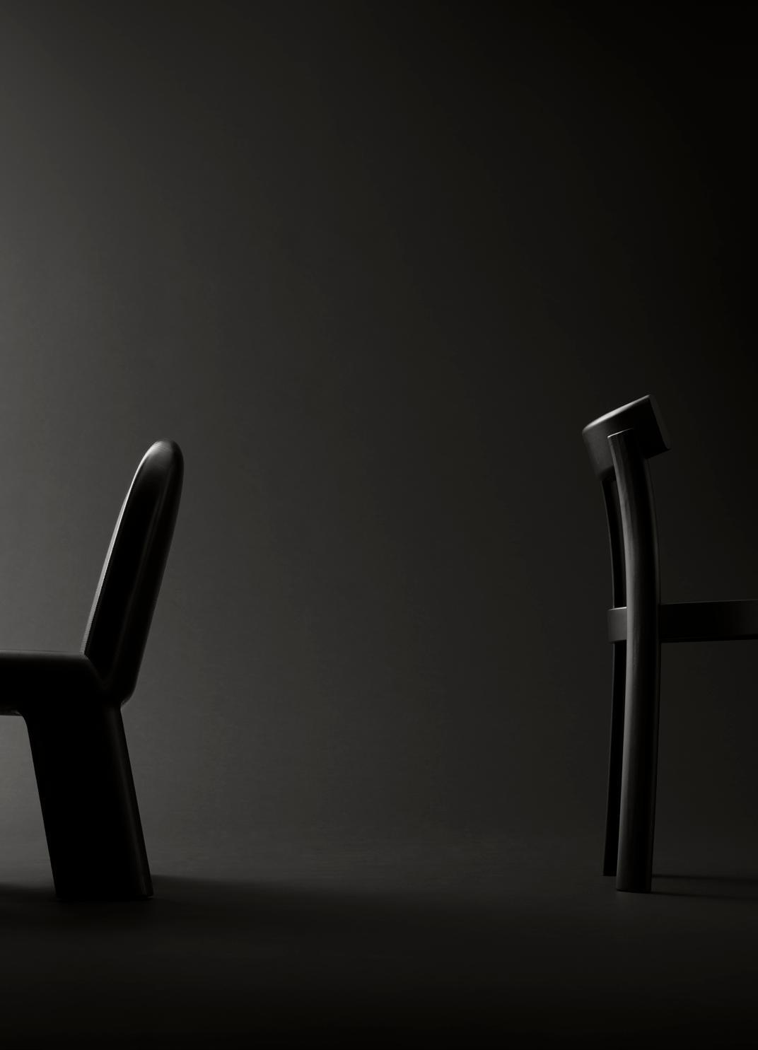 Efter stolen OM i traditionellt formpressat trä med nätta men generösa mått och en innovativ lösning av ryggen, sökte Johan Ansander någonting enkelt med fokus på detaljer, och med andra dimensioner för att ge en mer kroppslig, nära känsla. Som inspiration tänkte han på en del av sin egen underarm. Han ville också arbeta med mer volym i materialet och med rejäla radier, vilket man kan se i hur ryggen möter bakbenen. Ämnet i stolen är formpressad bok, för det är fint att ha ett lugnt träslag.