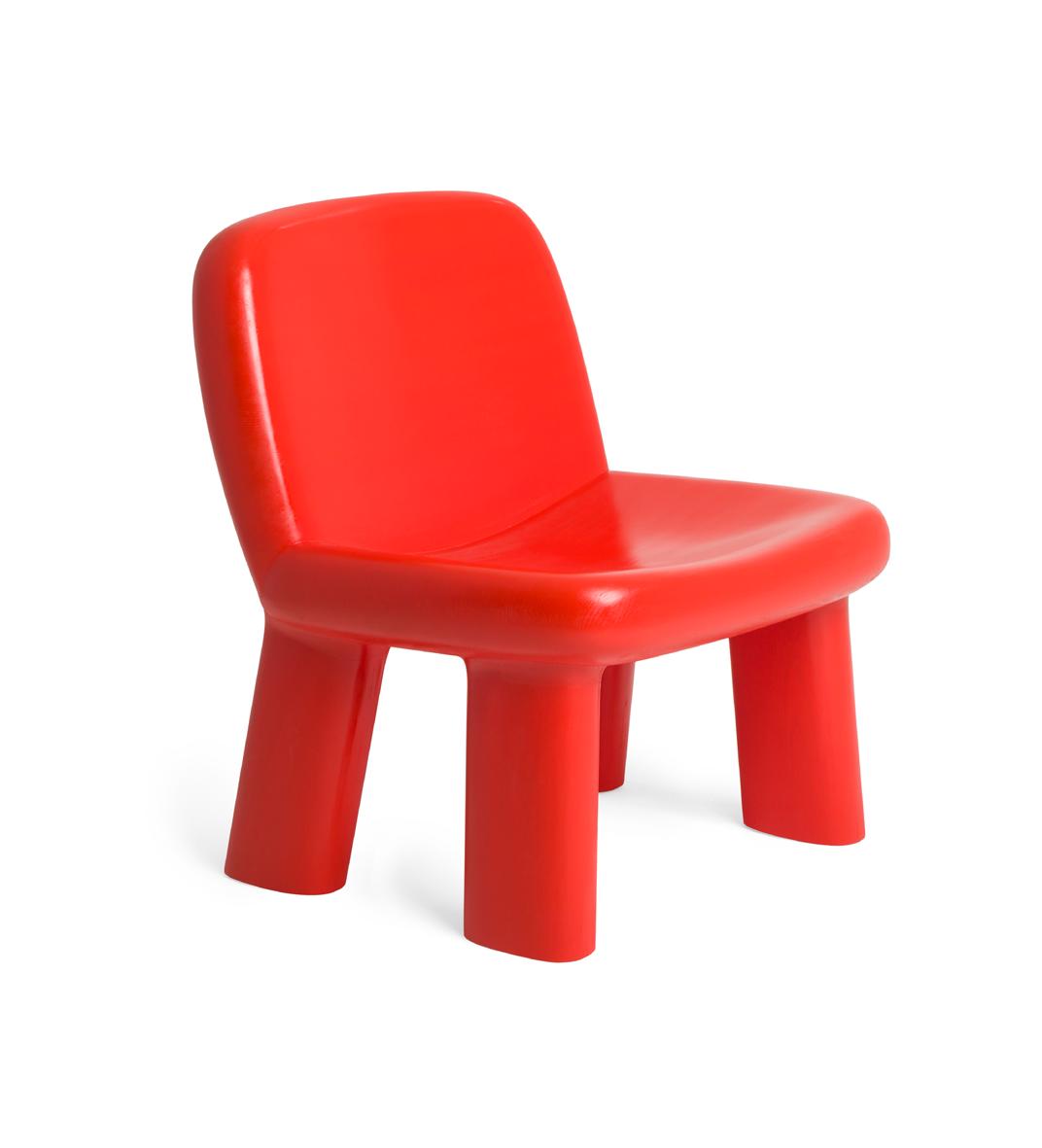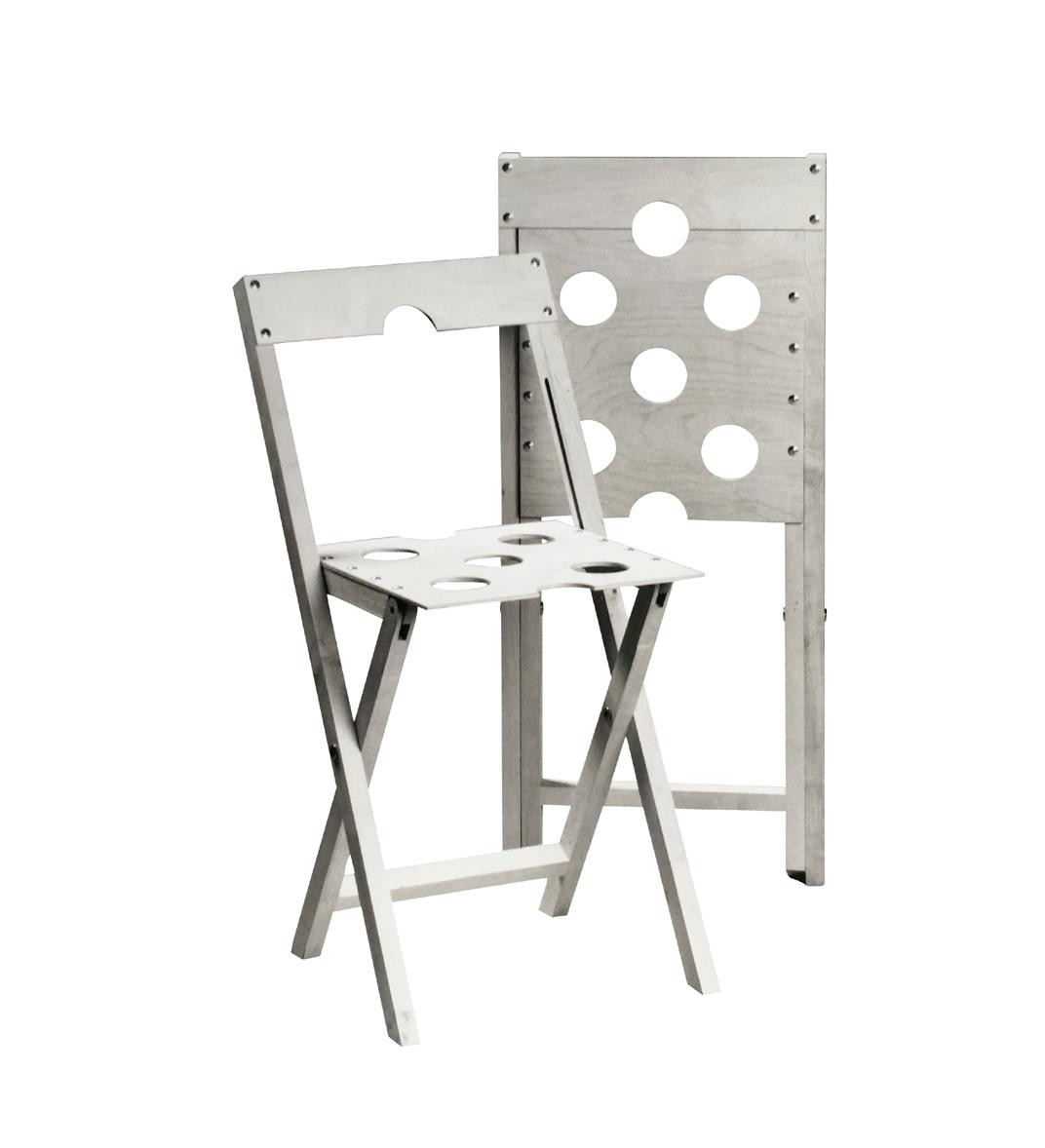 En skiva plywood som kan fällas ut till en stol med ben och sits, antingen åt det ena eller åt det andra hållet.