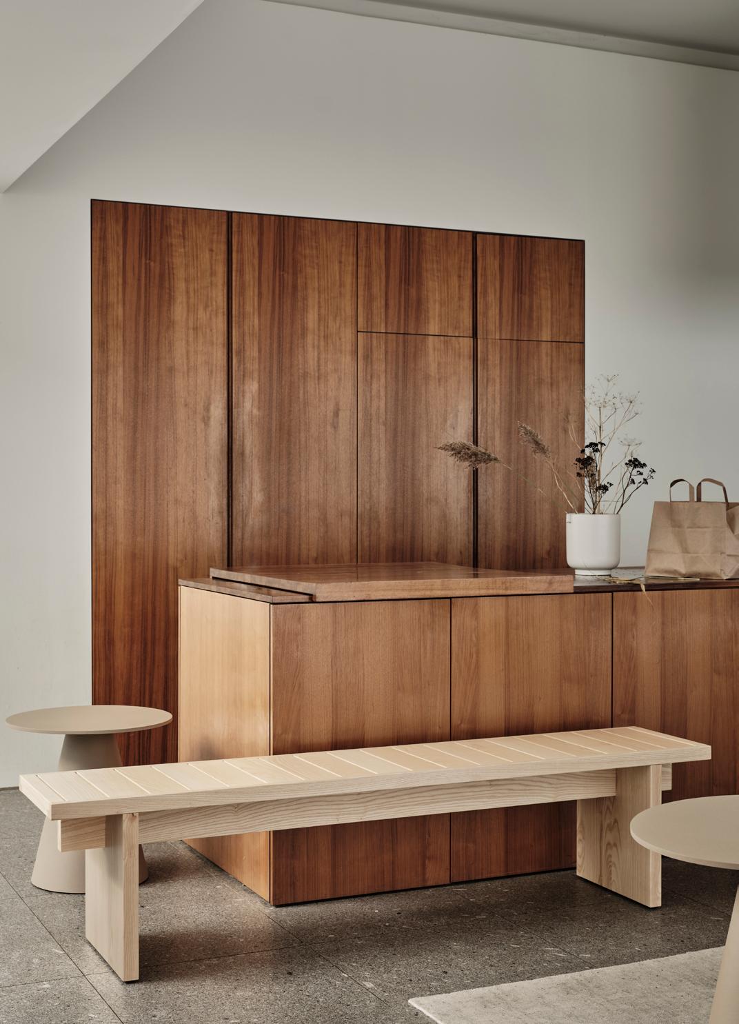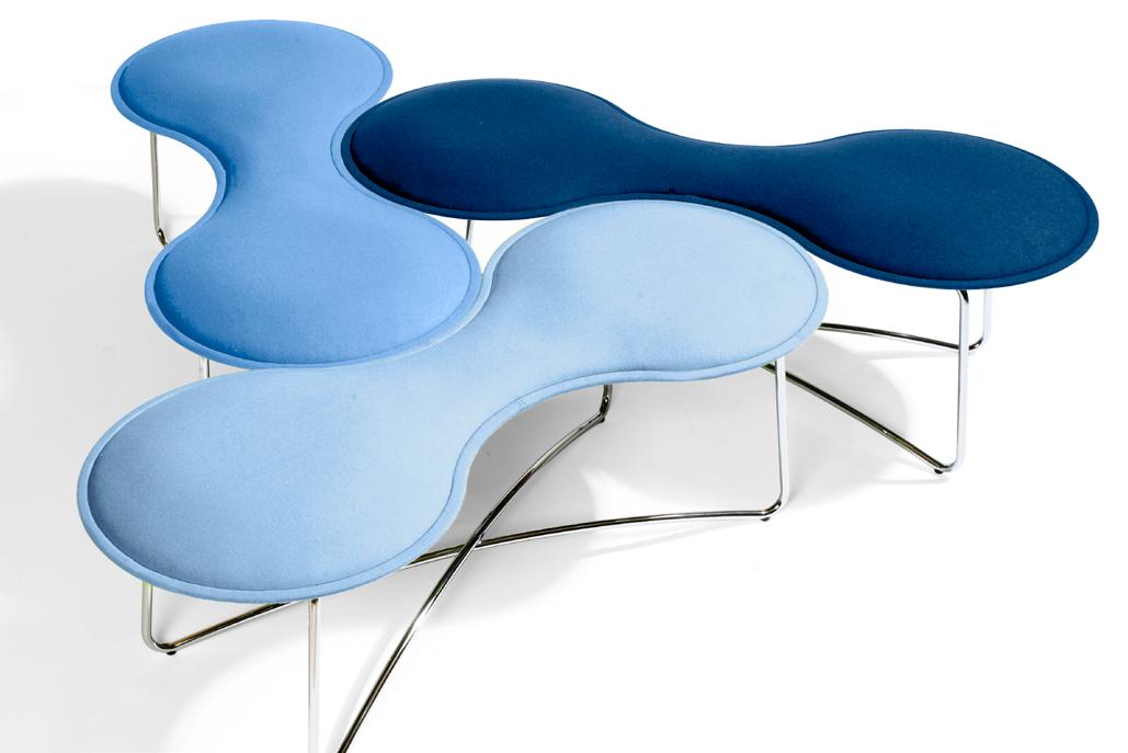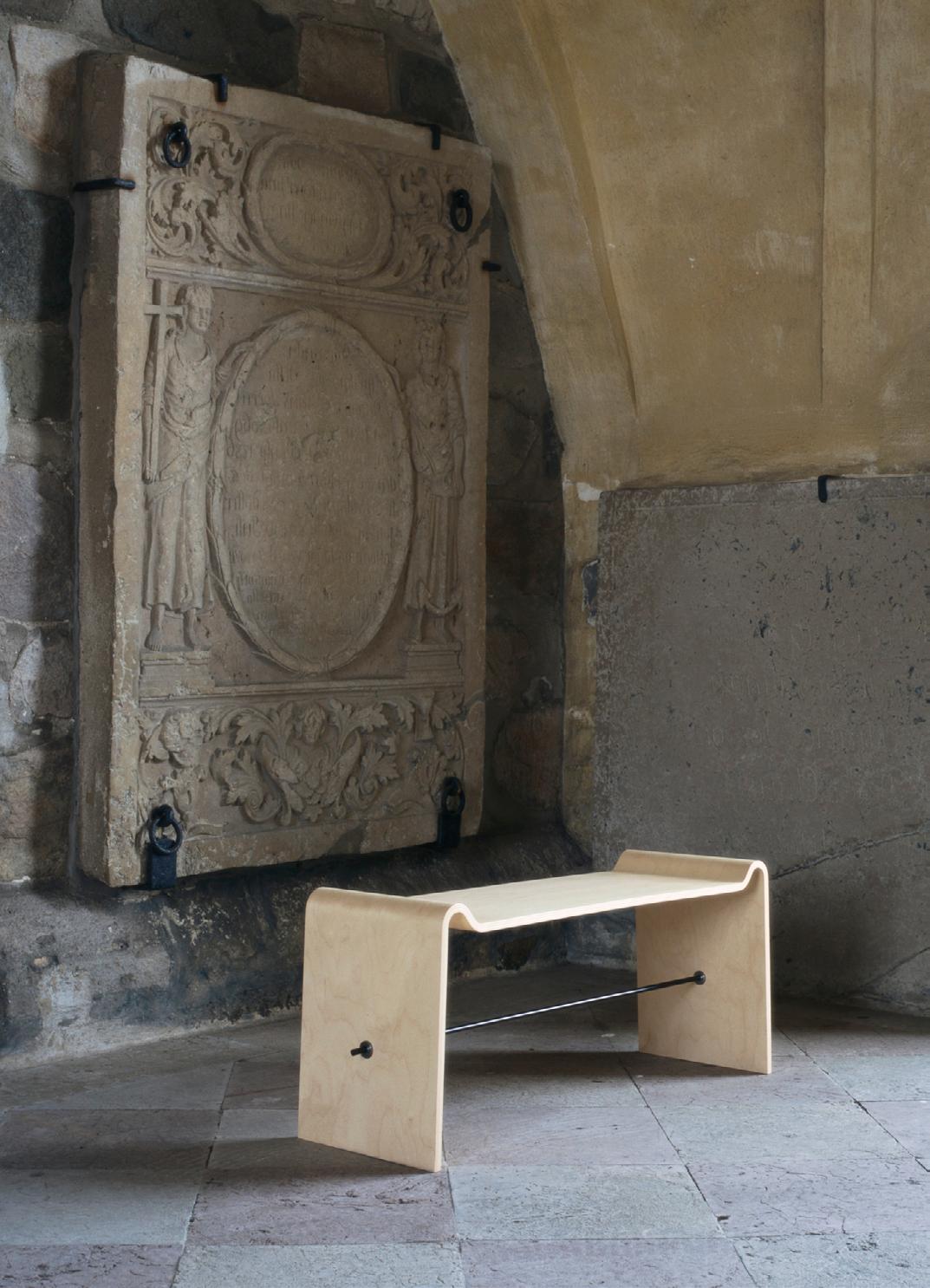 Deras bänk Hashi i formpressad björk, vars form var ett utsnitt av en gigantisk cirkel, kändes viktig för oss.