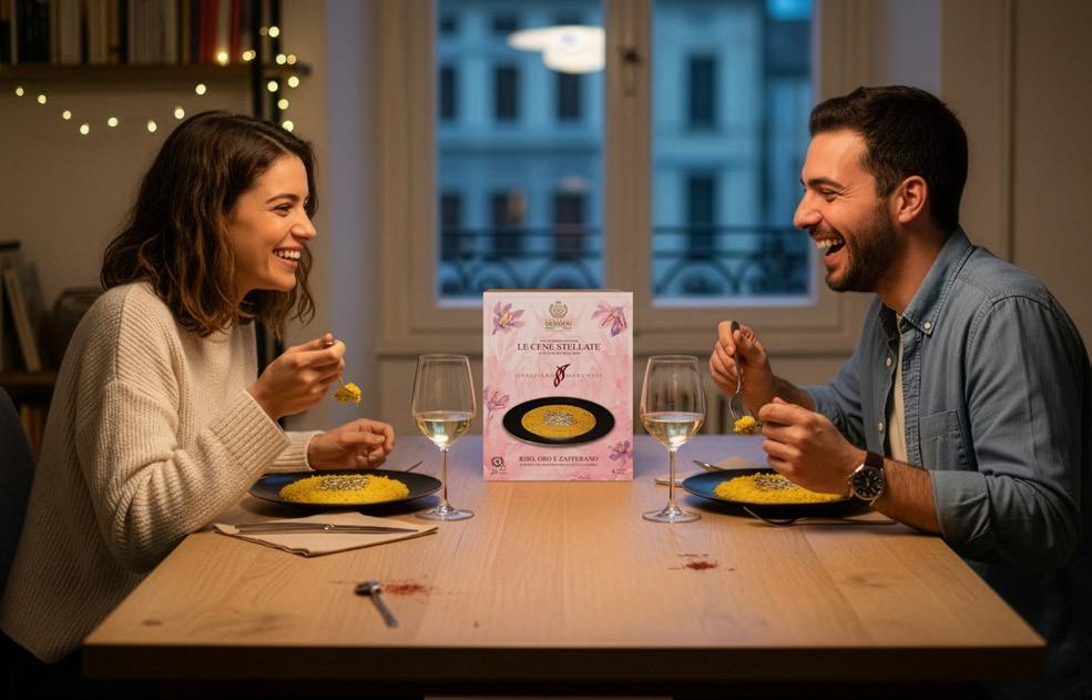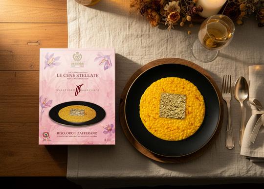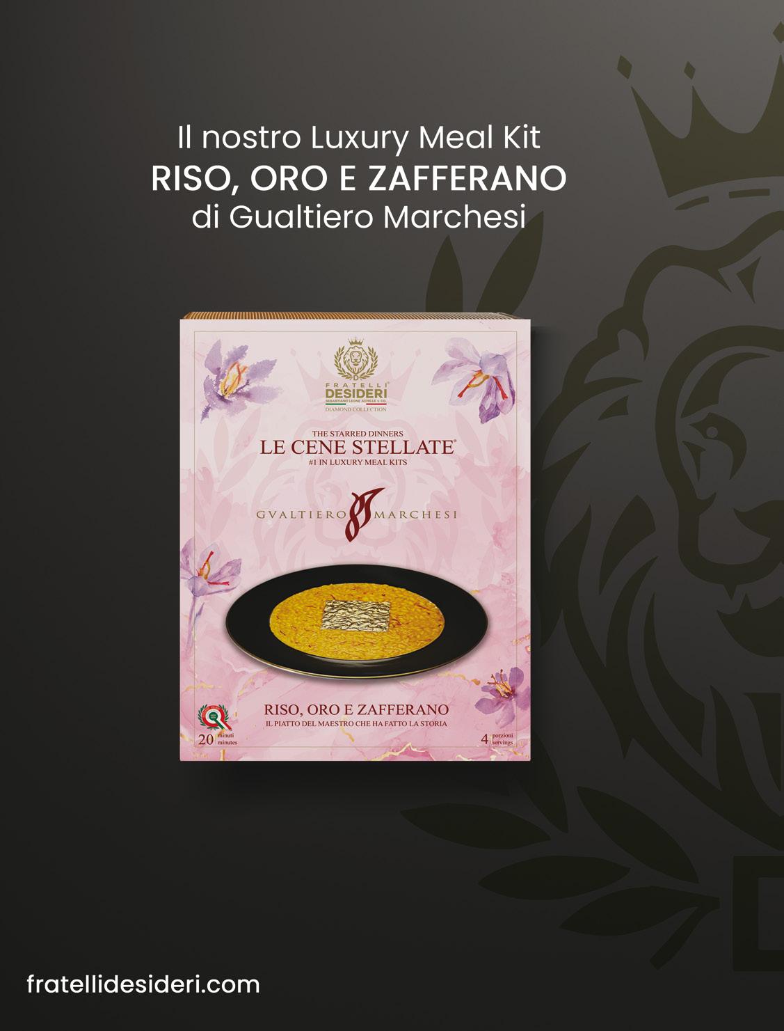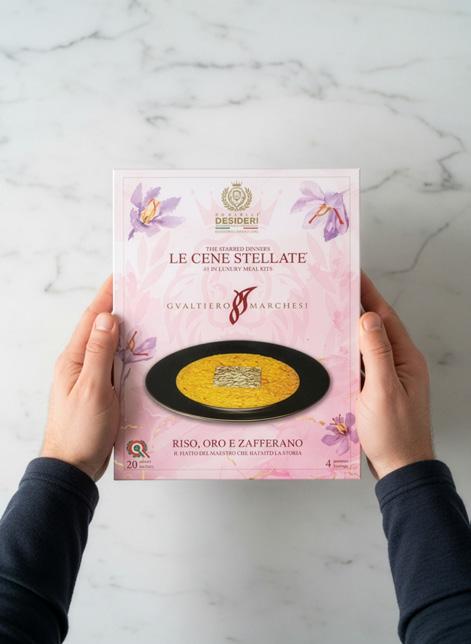 leaf that delicately yields at the first touch of the spoon. “It is the dish that best expresses my concept of beauty. Essential, with no frills,” Marchesi once said. In the Carnaroli kit, saffron threads, butter, cheese, broth and gold leaf create a ritual that transcends the recipe.