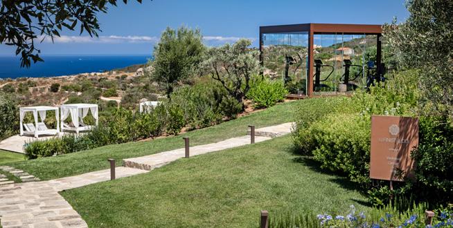 A spacious glass-enclosed dining room and poolside terrace are home to Corallia. Its name evokes the essence of the sea, offering a culinary journey through Mediterranean flavours enriched by international influences. The menu centres around locally sourced ingredients, including fresh vegetables and herbs from the organic kitchen garden, combining terroir, technique and a contemporary vision. Chef Giuseppe Spandri brings a refined and personal touch to every dish. His philosophy is rooted in fresh, local ingredients, small producers, minimal fats and the natural expression of flavour.