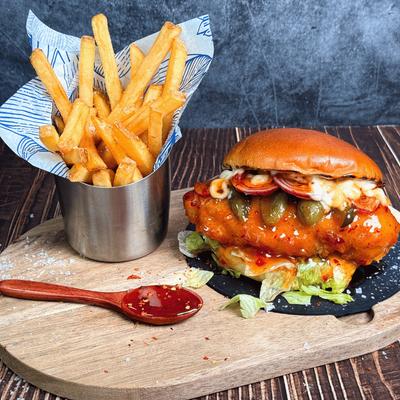 A crowd-pleasing burger that brings together crispy chicken, fresh salad and a drizzle of hot honey for a balanced sweet heat. A simple way to add a swicy option to your menu.