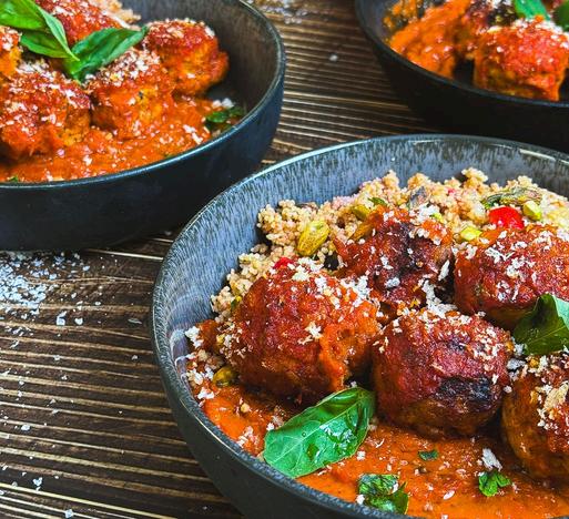 A bold and aromatic main dish, these pork and nduja meatballs are packed with smoky spice and balanced by a rich tomato sauce made with Blenders Tomato Ketchup and Chicken Bouillon. Served over fragrant pomegranate couscous with basil, pine nuts, and roasted red peppers, this dish delivers layered flavour and vibrant colour – ideal for showcasing on menus or serving as a generous special.