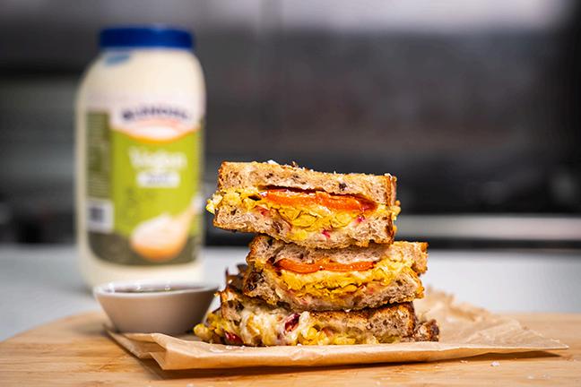 5.Spread Blenders Vegan Mayonnaise on the outer sides of the bread. Place in a sandwich press and toast until golden and sizzling.