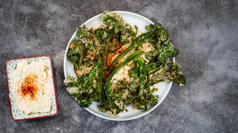 A crisp and flavour-packed dish, this Purple Sprouting Broccoli Tempura is a delicious, vegan-friendly option that brings together the vibrant taste of fresh broccoli and the satisfying crunch of tempura. Paired with a rich roast garlic and rosemary mayo, it’s perfect as a starter or a side, offering a unique twist on classic tempura with the added zing of fresh herbs.