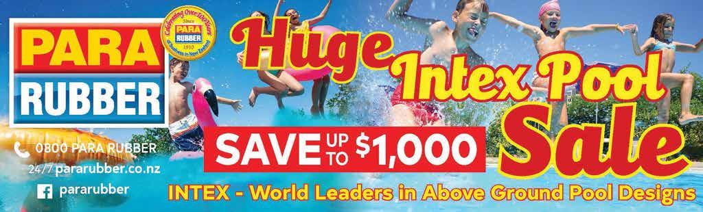 Wednesday February 8, 2023 24 Sun The “Better than a beach in your own backyard” PARA RUBBER NELSON | Phone 03 548 7162 | 165 Haven Rd, Nelson ULTRA FRAME ROUND 4.88 X 1.22M INTEX ULTRA 7.32 X 3.66 X 1.32M INTEX GRAPHITE POOL 4.78M X 1.25M ULTRA FRAME POOL 5.49 X 2.74 X 1.32M EXTRA LARGE ULTRA FRAME POOL 9.75 X 4.88 X 1.32M PRISM FRAME RECTANGULAR POOL 3.9M X 2M X 1.2M Ultra Frame Pool frames are stronger than traditional metal frame pools. This is an easy to run family pool. Puncture resistant 3 play material Comes complete with Filter Pump, Safety Ladder, Ground cloth and Pool Cover True neighbourhood size pool. Complete with high performance Sand Filter Pump, Safety Ladder, Ground Cloth and Debris cover. Soft gray laminated pool liner, brilliant white copings and pool water blue tile print make a fashion statement anywhere. Our top of the range Graphite Pool is made of high density plastic panels. It is very easy to assemble and comes with puncture resistant 3 ply liner and a Sand Filter to keep the pool crystal clear. Set includes Safety Ladder, Ground cloth and pool cover. Intex Ultra Pools are the best selling above ground swimming pools in the world. The Ultra Frame pool comes with a high capacity sand filter pump, Safety Ladder, Ground Cloth and Debris Cover. 18x9x52 Family size Our very large Intex Ultra Frame Pool is the absolute ultimate in above ground pools. Measuring a huge 9.75m x 4.88m x 1.32m this truly is a pool for everyone. Great for lifestyle properties. Complete with large capacity Sand Filter Pump, Safety Ladder, Ground cloth and Debris cover. Perfect for smaller gardens. All the advantages of a larger pool. It includes Filter, Pump and Ladder. Easy set up in about 45 minutes. WAS $2,299 WAS $3,999 WAS $3,999 WAS $2,499 WAS $4,999 WAS $1,499 NOW $1,599 NOW $3,299 NOW $3,599 NOW $1,999 NOW $3,999 NOW $1,199 SAVE $700 SAVE $700 SAVE $400 SAVE $500 SAVE $1000 SAVE $300