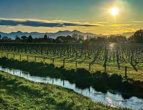 Winter Vineyard in the late winter sun: The distant mountains are part of the Richmond Range. The waterbody is a creek that runs through some vineyards. The vines in this vineyard are yet to be pruned. Photographer Liz Davidson says she often photographs the creek and its environs from a different angle and at various times of the year.