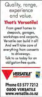 Sun The Wednesday September 6, 2023 4 MultiDig is a successful, well established, earthworks contractor, in Marlborough, with a wide range of skills and machinery to service your residential, commercial and industrial projects. We have a fresh new look, but the same name and great service for our clients. WE GET INVOLVED IN: • Excavation & site work solutions • Subdivision & residential development projects • Post hole augering • Screened soil sales • Trenching • Lawn preparation • Concreting We pride ourselves on doing what we say we will, being honest, practical and reliable. Call Tony on 021 52 52 69 or email tony@multidig.co.nz MULTIDIG.CO.NZ 0800 VERSATILE versatile.co.nz ADVANTAGE RANGE *Terms and conditions apply. Unlock the full potential of your land and create lasting value. The new Advantage Range offers six consent-ready home plans designed to ensure a cost-effective, quick and streamlined build process, so you can start building your new home sooner. These contemporary homes are compact yet perfectly formed, ranging in size between 30-80m² and feature between 1-3 bedrooms. Each plan offers all the modern comforts and quality you would expect from a Versatile home. Enquire about the Advantage Range today! Why choose Advantage Range? • Designs perfectly suited for secondary dwellings, with sizes from 30-80m2 • Affordable, contemporary living with no compromise on quality • Standardised, consent-ready plans for a streamlined build process • Personalise with exterior and interior colour options • Build with confidence by partnering with a company with over 40 years of building better for New Zealander’s. Build price from $158,400* Versatile Blenheim 11 Boyce Street, Springlands | Ph 577 7212 Add value to the way you live