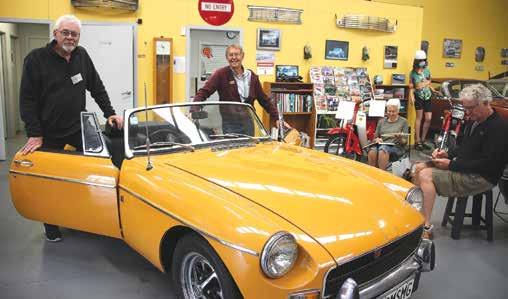 Omaka Classic Cars volunteers, Bruce Morton and Dexter Abernethy with an eye-catching MG as artists Jan Thomson and Pete James work in the background. Photo: Paula Hulburt.