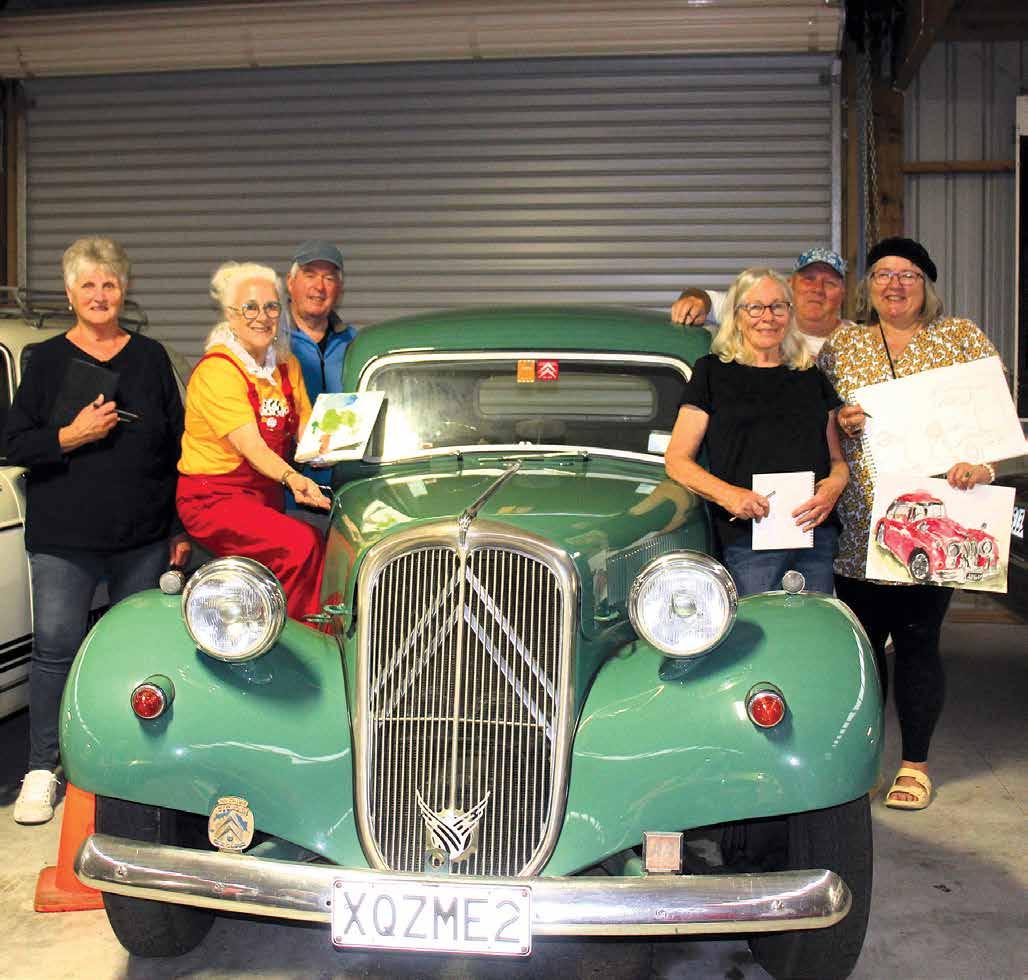 Members of Marlborough Art Society, from left, Mary Russell, Carolyn Costley with Classic Cars founder Ron Stewart and fellow members Anne Barrer, Stewart Brewer and Annette Michna-Konigstorfer with a Citroen Light 15 from 1952. Photo: Paula Hulburt. Story page 4.