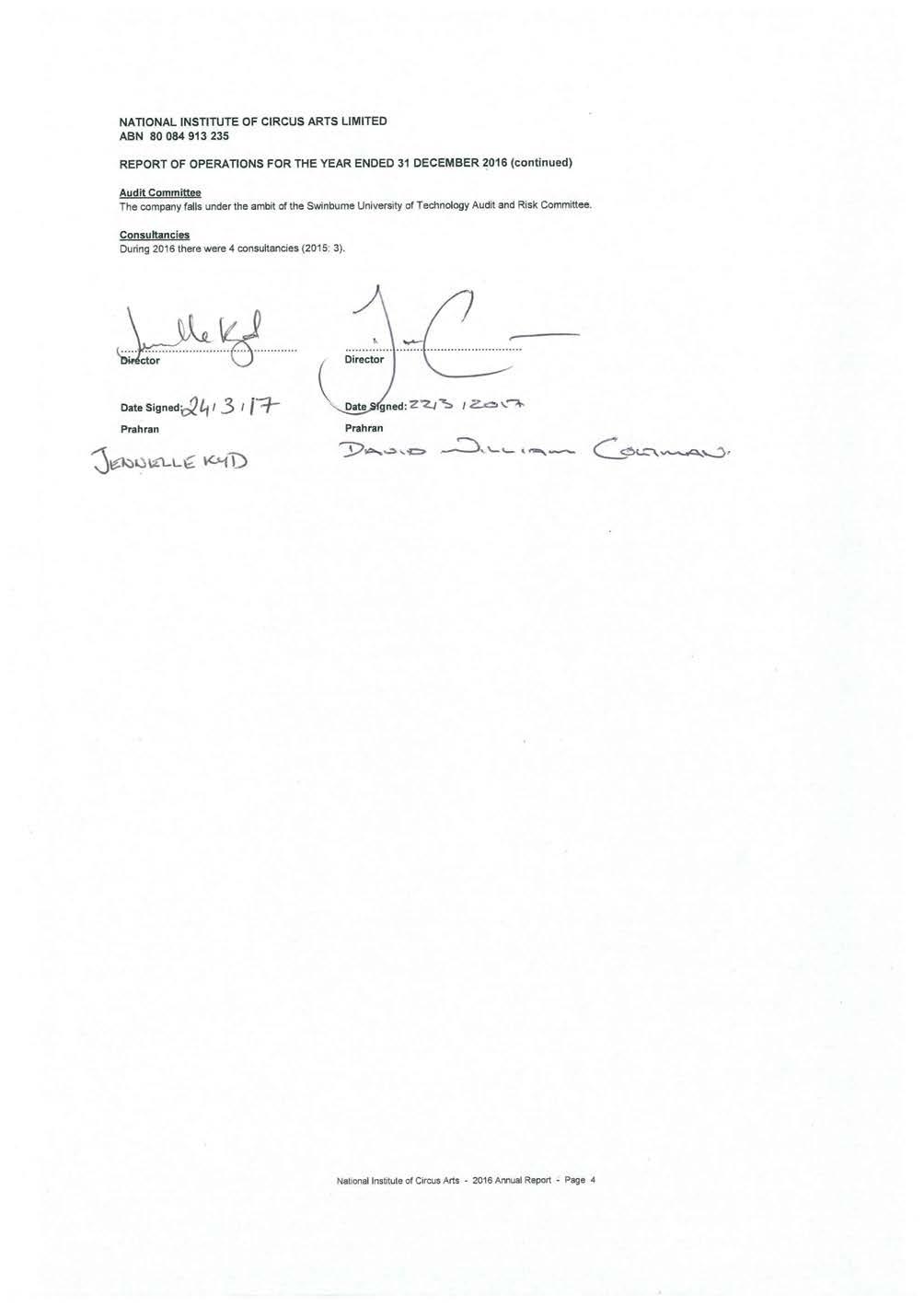 Our achievements would not be possible without the dedicated staff who put in so much effort to ensure that NICA produces a high level of artistic output, maintains sound business systems and governance, and raises its profile. Not only the training staff, but the staff behind the scenes deserve a huge thank you. I wish to express my gratitude to all for another productive year with many more to come.