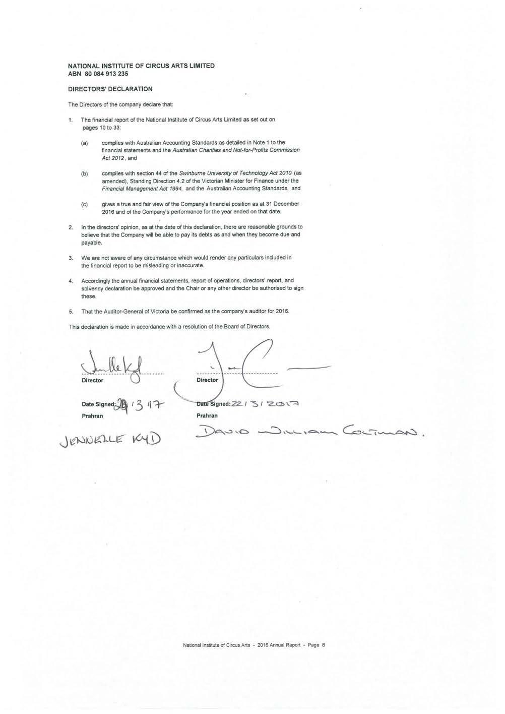 I would like to take this opportunity to thank the Pratt Foundation, the Sun Foundation, Swinburne University and the City of Stonnington for their generous support in 2016. The funding helped support students in their studies, assisted with travel costs for the international study tour and supported our community Youth Circus Finale. It also supported NICA to bring international expertise to Melbourne for artistic direction of shows and masterclasses. Our relationship with these organisations is very much valued and appreciated.