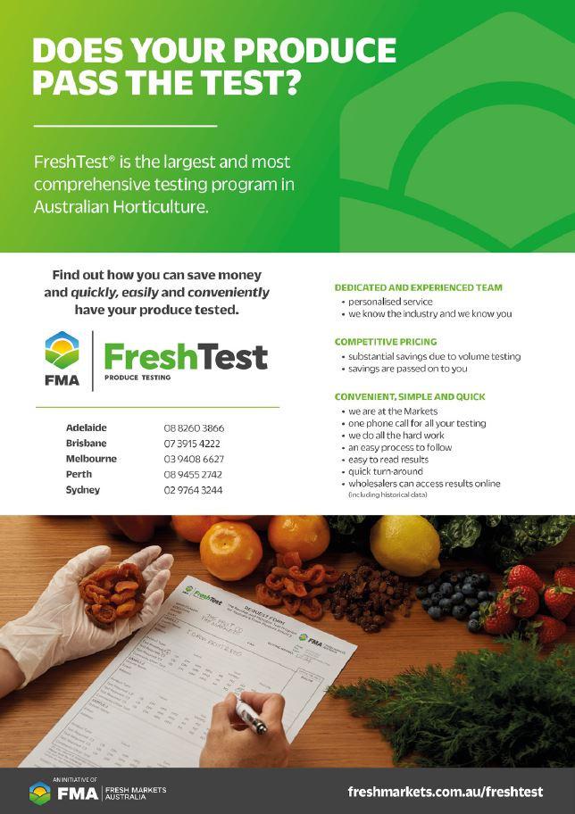 Since its introduction in December 2001, Fresh Test has grown to become one of the largest and most comprehensive horticultural residue testing programs undertaken in Australia. Fresh Test offers an extensive range of tests, from Heavy metals, MRL (chemical residue) to Microbial testing. All results are confidential and are used for verification for food safety and Quality Assurance systems. We are one phone call away for all your Fresh Test needs. Working out of the Fresh State office, please complete the form which is available on our website www.freshstate.com.au/services/fresh-test/, you