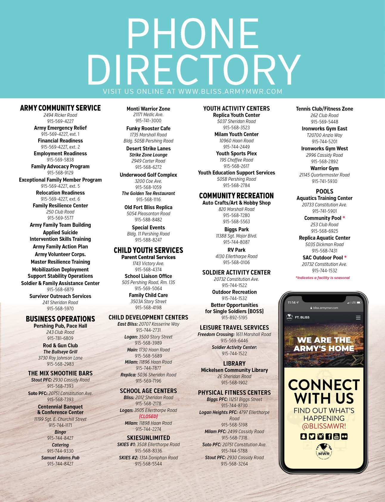 The information in this issue is current at the time of publication; activities and events are subject to change without notice. Downloading of any social media apps is on a voluntary basis. DFMWR is not responsible for any negative consequences resulting in its use. For more information, call the individual facilities. Family and MWR Marketing is located in Building 12 Pershing Road Fort Bliss, TX 79916 and may be reached at 915-568-6741.