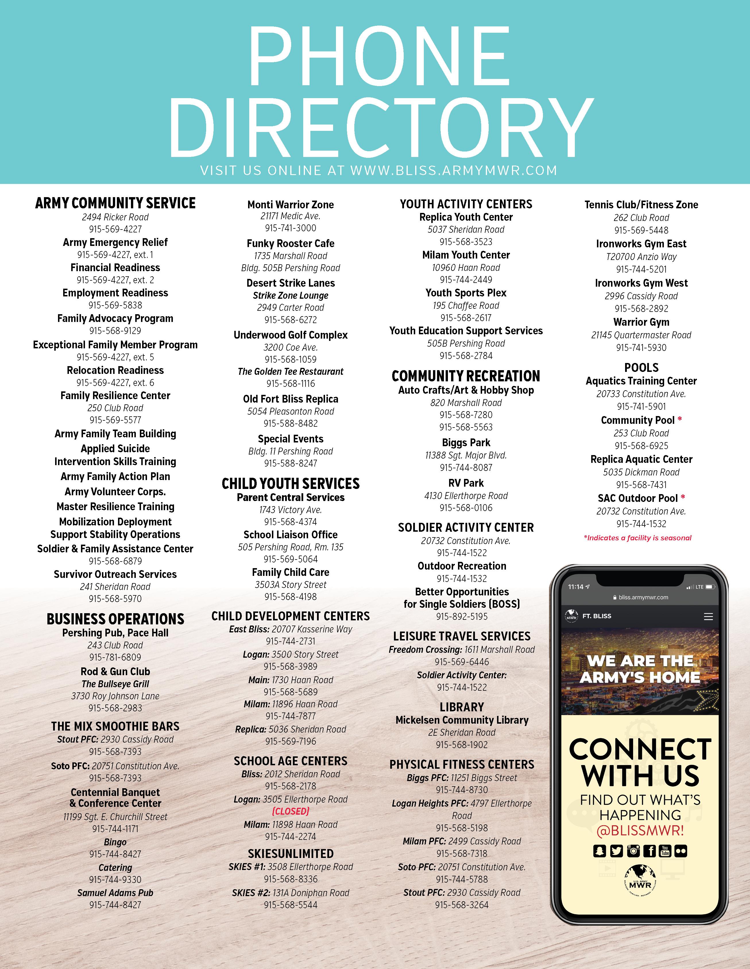 RADFORD AVE. BORDERROAD CASSIDY GATE PERSHING GATE (CLOSED) MARSHALL ROAD DONIPHAN ROAD DONIPHAN ROAD Pool CUSTER ROAD SHERIDAN ROAD SHERIDAN SHERIDAN ROAD CLUB ROAD SLATER ROAD MERRITTROAD PIKE ROAD PERSHING ROAD PERSHINGROAD PERSHINGROAD RICHMOND AVE. AURORA AVE. GATEWAY SOUTH BLVD. GATEWAY NORTH BLVD. TOMPKINSROAD HOWZE STREET FRED WILSON ROAD ALABAMASTREET HAYES STREET RUSSEL SREET DYER STREET FRED WILSON GATE SHERIDAN GATE SOMERVILLE AVE. WOLFF AVE. VICTORY AVE. MCNAIR AVE. HAAN ROAD ARTILLERY ROAD Building locations Military Gates Wi-Fi locations Hospital Shopping/Co ee/Food areas Groceries Religious Services Gas Stations International Airport LEGEND Fort Bliss and Family & MWR Facilities KEYS EMERGENCY NUMBERS Fire Emergencies 915-568-1117 Housing Areas 915-565-4100 Military Police 915-744-2115 Ambulance 915-744-2115 915-568-2121 No. Organization Bldg. Phone 1 Adujtant General 1 915-568-3301 2 American Red Cross 45 915-568-4849 3 Armed Services YMCA 7060 915-562-8461 4 Army Community Service (ACS) 2494 915-569-4227 5 820 915-568-7280 6 Bowling Center/Desert Strike Lanes 2949 915-568-6272 7 Car Wash 197 915-630-8669 8 Child Development Center, Main 1730 915-568-5689 9 Child Development Center, Replica 5036 915-569-7199 10 504B 915-568-6287 11 Commissary 1620 915-568-4022 12 Community Pool 253 915-568-5380 13 Family MWR Headquarters 11 915-568-3500 14 Family MWR Marketing 12 915-568-6741 15 Family and Resilience Center (FRC) 250 915-569-5500 16 801 915-562-5451 17 Freedom Crossing PX: • Post Exchange, Grand Theatre • Third-party shops 1613 915-562-7200 18 505 19 Garrison Command 1741 915-568-2833 20 VA Clinic 7777 915-564-6100 21 • Kelly Park 1991 915-564-0795 915-569-1133 22 1741 915-568-2898 23 IHG Army Hotels at Fort Bliss 1744 915-565-7777 24 In-Processing/Welcome Center 505 915-568-3035 25 Inspector General 21 915-568-1241 26 Ironworks Gym West 2996 915-568-2892 27 Junior Enlisted Family Center 2004 915-263-7164 28 LTS Kiosk at Freedom Crossing 1611 915-569-6446 29 Legal Assistance 113 915-568-7141 30 Mickelsen Community Library 2 915-568-6156 31 Milam Physical Fitness Center (PFC) 2499 915-568-7318 32 Old Ironsides Museum 1735 915-568-5412 33 Old Fort Bliss Replica 5054 915-568-4518 34 2968 915-568-7393 35 Outbound Transportation 503B 915-568-9699 36 Parent Central/CYS Registration 1743 915-568-4374 37 Pershing Pub 243 915-781-6809 38 1733 915-562-4036 39 POV Car Resale Lot 915-569-6446 40 Recycling Center 1250 915-568-5437 41 Replica Pool 5035 915-568-7431 42 Replica Youth Center 5037 915-568-3523 43 School Age Center, Bliss 2010 915-568-2178 44 SKIESUnlimited #2 131A 915-568-5544 45 Soldier & Family Medical Clinic 2496 915-742-3858 46 Stout Physical Fitness Center (PFC) • The Mix Smoothie Bar 2930 915-568-3264 915-568-7393 47 Survivor Outreach Services (SOS) 241 915-568-5970 48 Tennis Club & Fitness Zone 262 915-569-5448 49 USO 2408 915-569-5644 50 Vehicle Registration 503A 915-568-1890 51 Veterinary Services 6077 915-742-2266 52 Youth Sports Plex 195 915-568-KIDS page 13 JUNE | 2023 @blissmwr