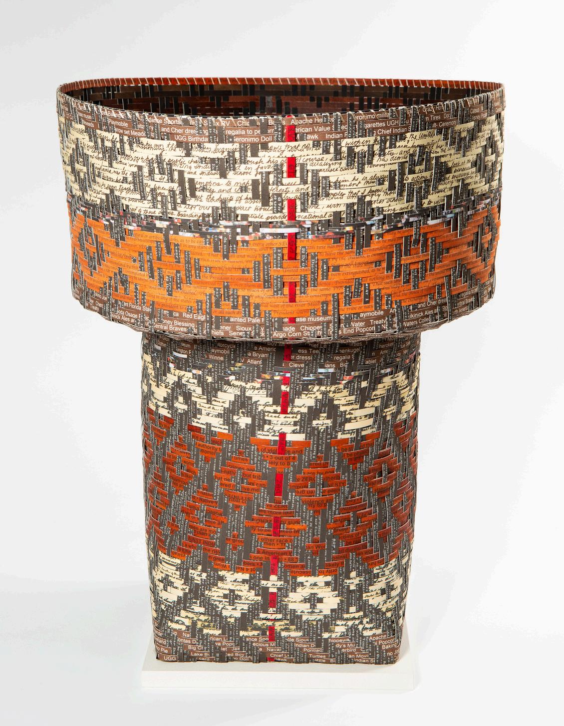 Shan Goshorn’s Cherokee Burden Basket uses texts from documents such as the mission of the Carlisle Indian Industrial School, the United States Indian Removal Act (1830), and the Treaty of New Echota (1835). The texts are printed out in strips, or splints, and woven into the traditional form of a burden basket. The baskets are designed to carry heavy loads, and basket weaving is a skill passed down through generations of Cherokee women. In Goshorn’s basket, the burdens are both physical and metaphorical. Several of the documents the artist included bring attention to US laws and ideologies that have sought to assimilate Native Americans and to erase their culture. These are balanced with Cherokee cosmological symbols of the four directions and their symbolic colors—red (east), black (west), white (south), and blue (north)—and traditional morning and evening songs that have the potential for healing.