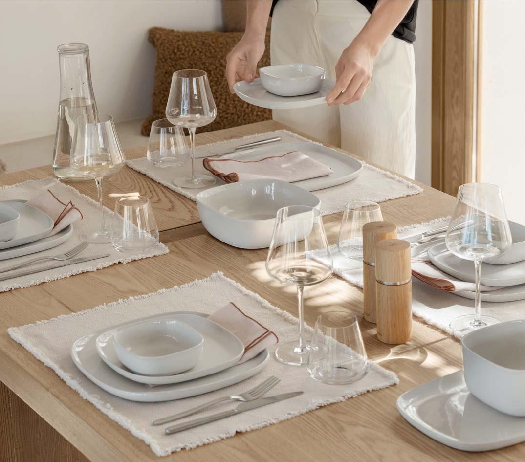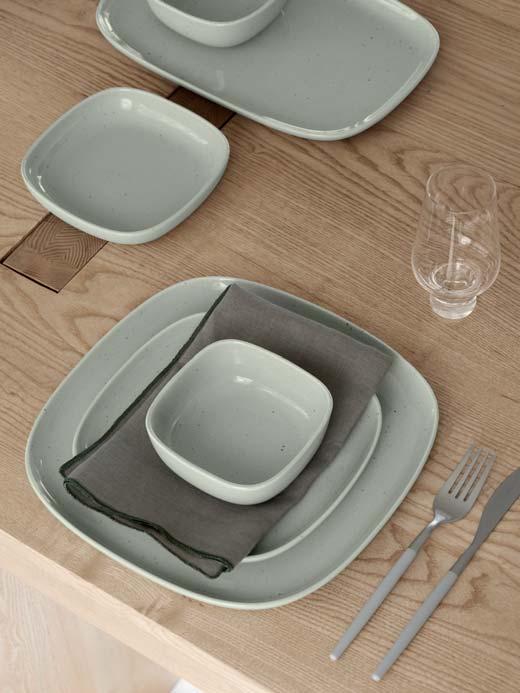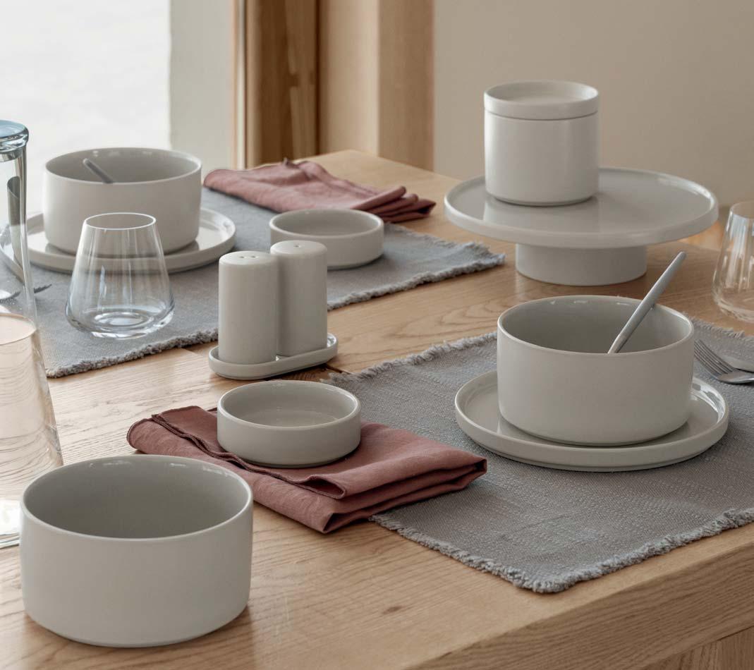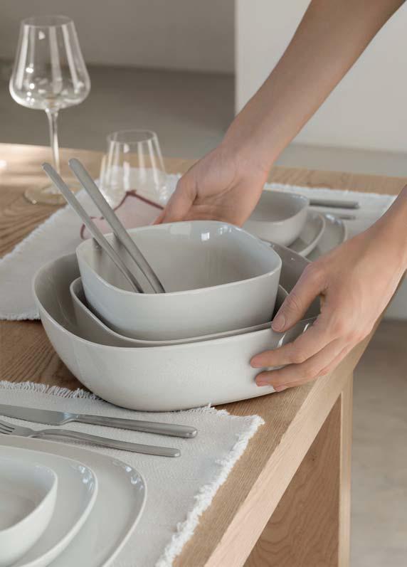 Schlicht, elegant und weich – diese Worte beschreiben die neue Geschirrserie VAHLO vom deutschen Designer Sebastian Herkner per fekt. Die abgerundeten Ecken machen das Design besonders und heben es von klassisch runden Geschirrkollektionen ab. Die aus elf unterschiedlichen Produkten bestehende Serie ist aus hochwertigem Steingut gefertigt, welches durch die glänzende Glasur veredelt wird und die schlichten Farben Moonbeam un d Mirage Gray in einem eleganten Glanz präsentieren. VAHLO wird bei 1200°C gebrannt und besteht aus verschieden großen Tellern, Schalen, Salatschüsseln, einem Becher und einem 2er Set Kaffeetassen.