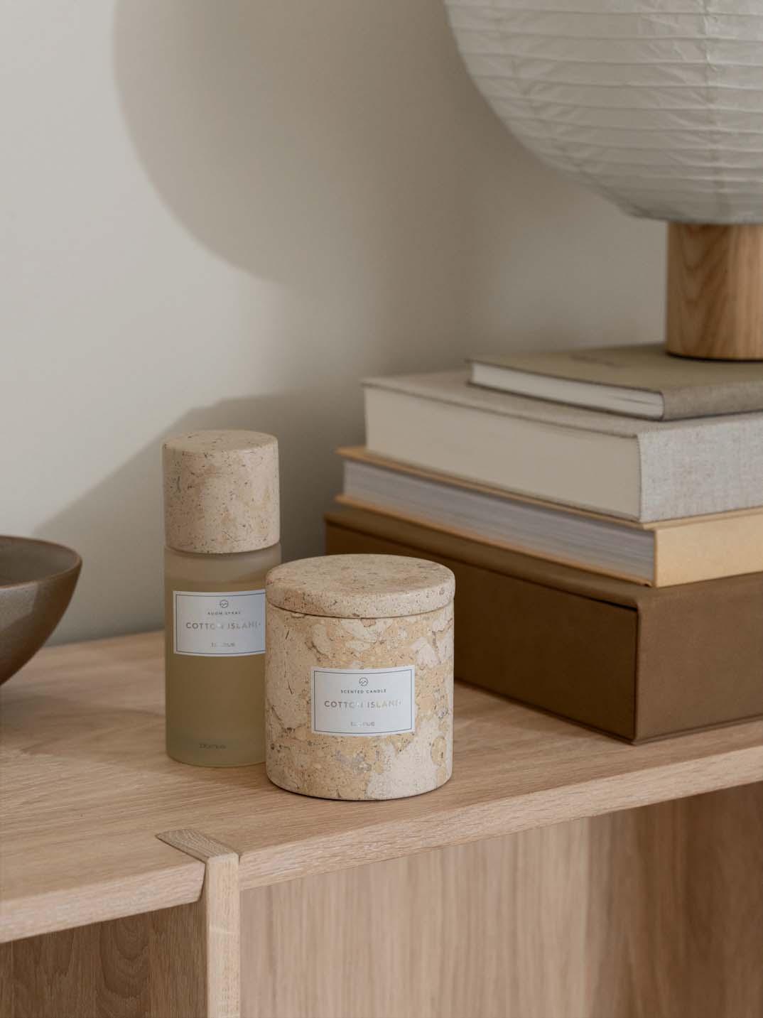With the FRABLI room spray, you can distribute the pleasant and refreshing fragrances of the scented candles of the same name in your home. Not only the fragrance compositions but also the design of the sprays with the elegant marble and travertine lids are the perfect match for the candles and are the ideal accessory for your bathroom or living room.