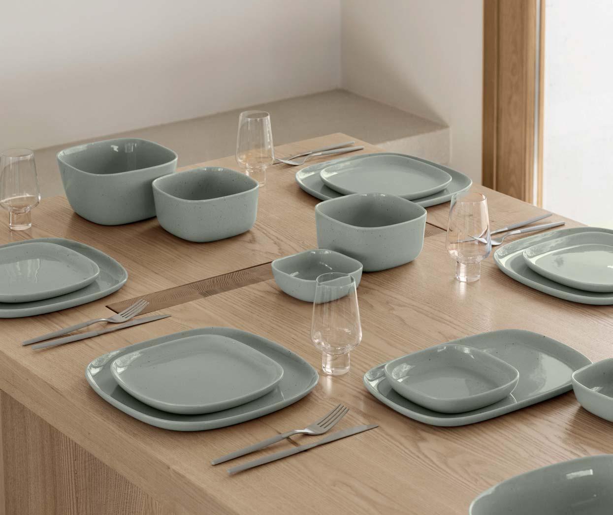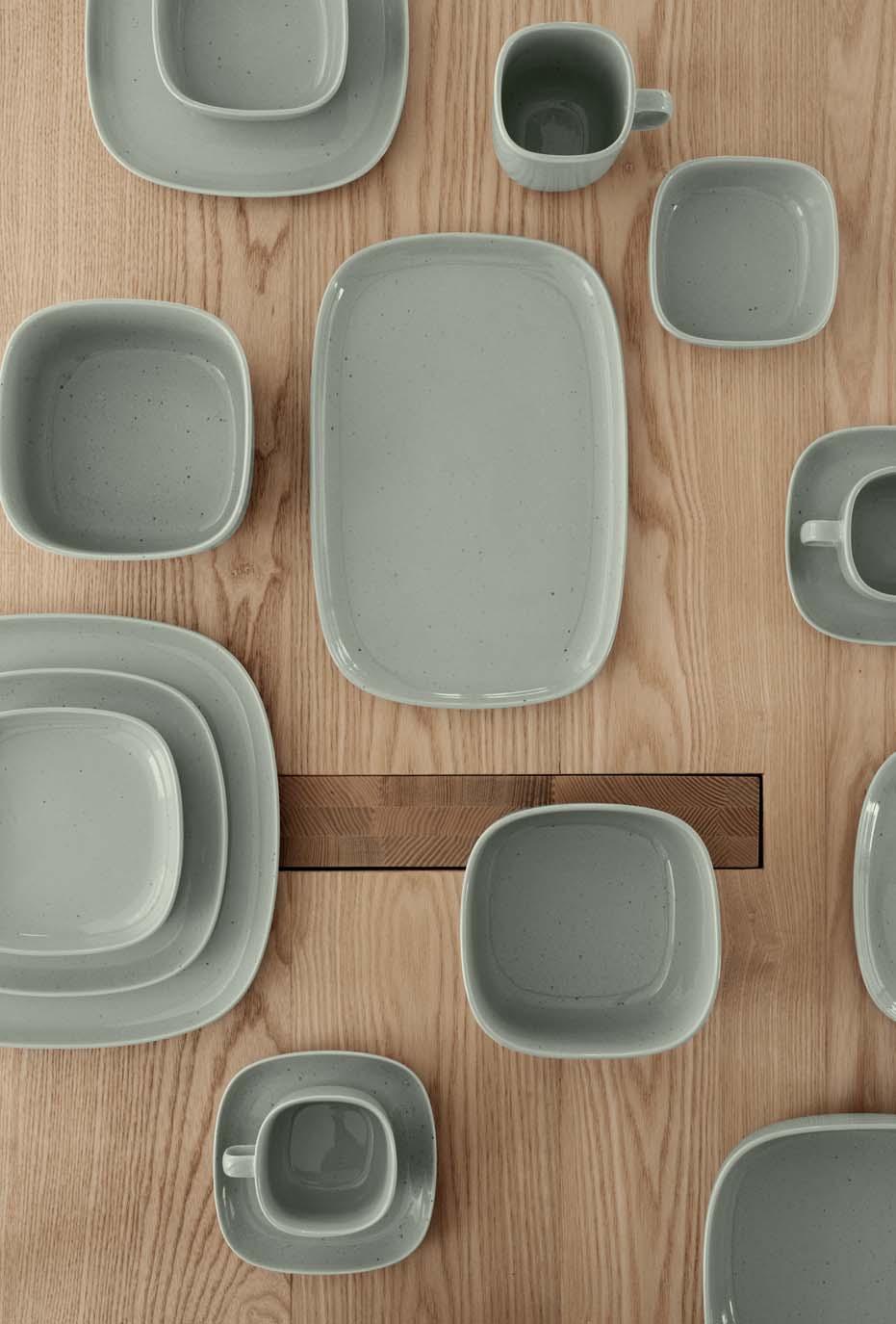 Simple, elegant and soft – these words perfectly describe the new VAHLO tableware series by German designer Sebastian Herkner. The rounded corners make the design special and set it apart from classic round crockery collections. The series, consisting of eleven different products, is made of high-quality stoneware, which is refined by the glossy glaze and presents the simple colours Moonbeam and Mirage Gray in an elegant sheen. VAHLO is fired at 1200°C and consists of different sized plates, bowls, salad bowls, a mug and a set of two coffee cups.