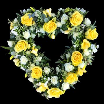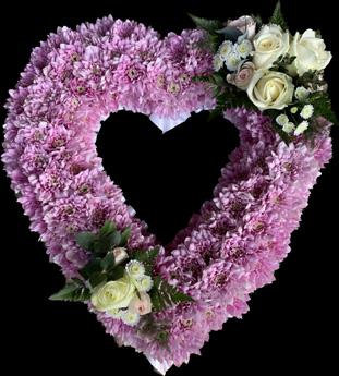 Hearts are a beautiful and personal tribute to a loved one. Available in a solid or open style in mixed flowers or massed chrysanthemums with contrasting accent sprays.