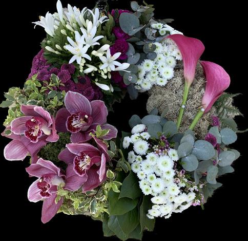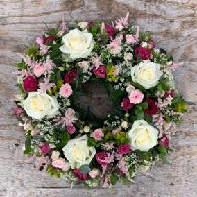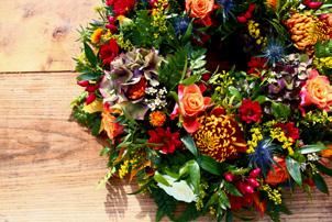 A beautiful tribute overflowing with flowers and foliage in a traditional wreath shape.